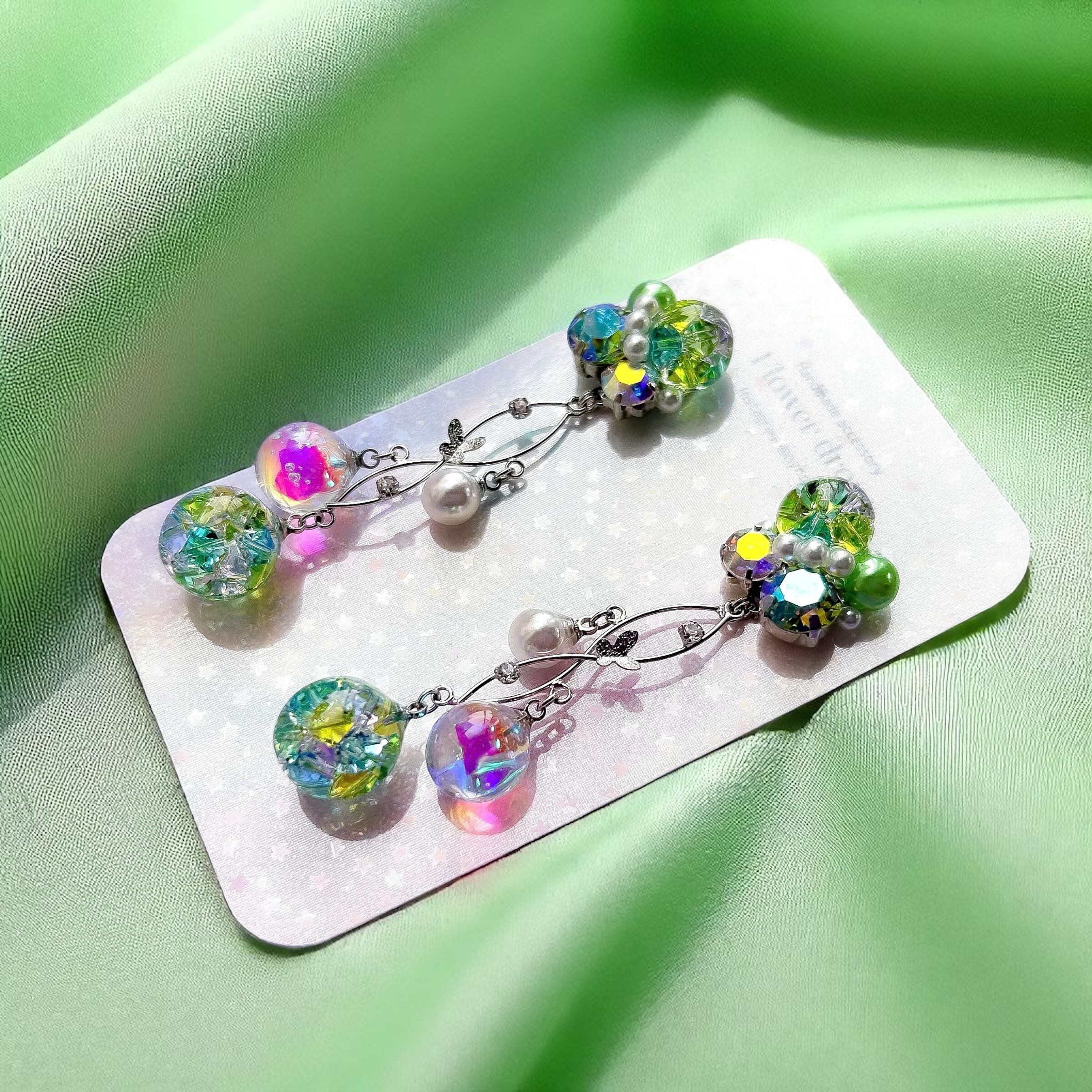 クリスタルドームビジューの耳飾り(黄緑系ミックス)