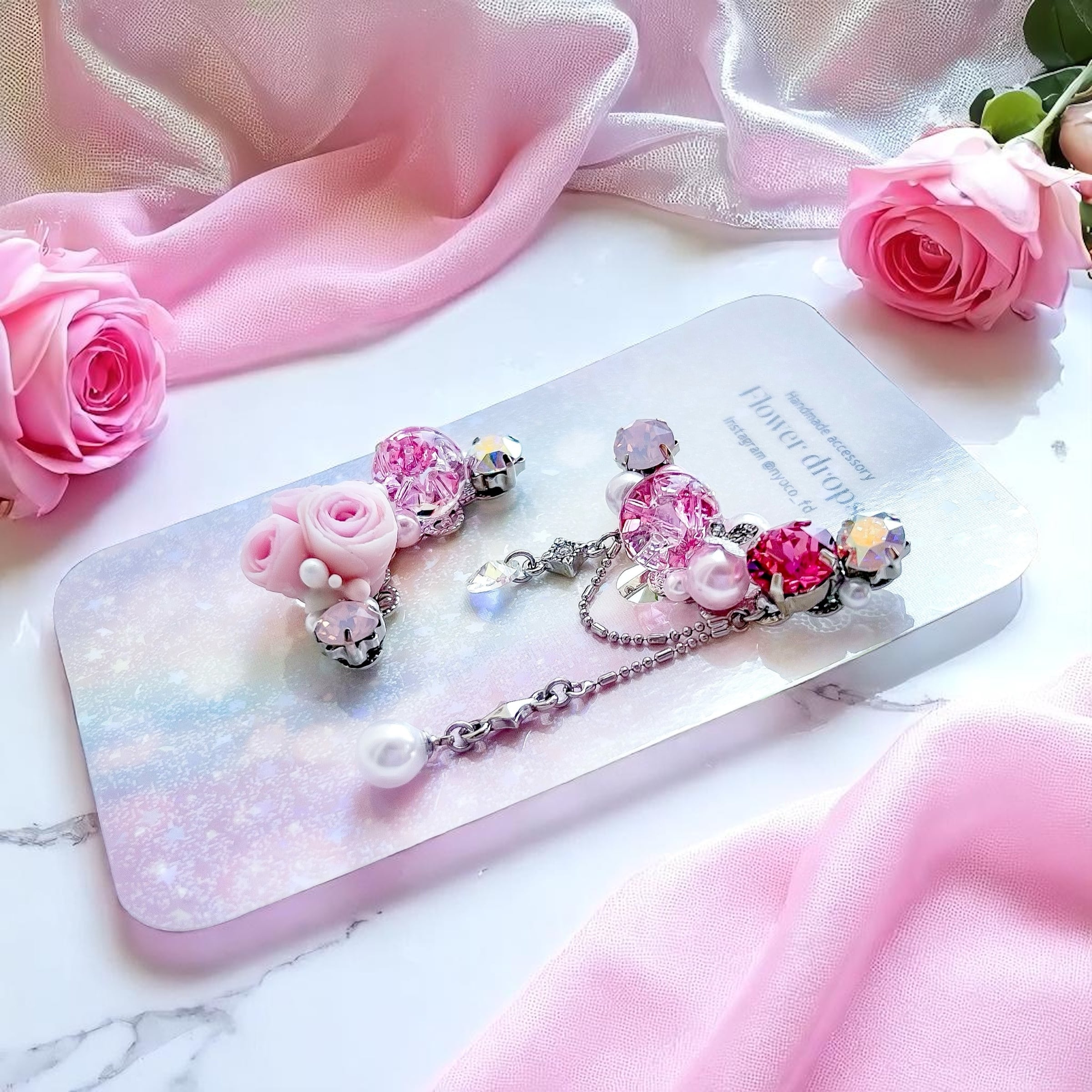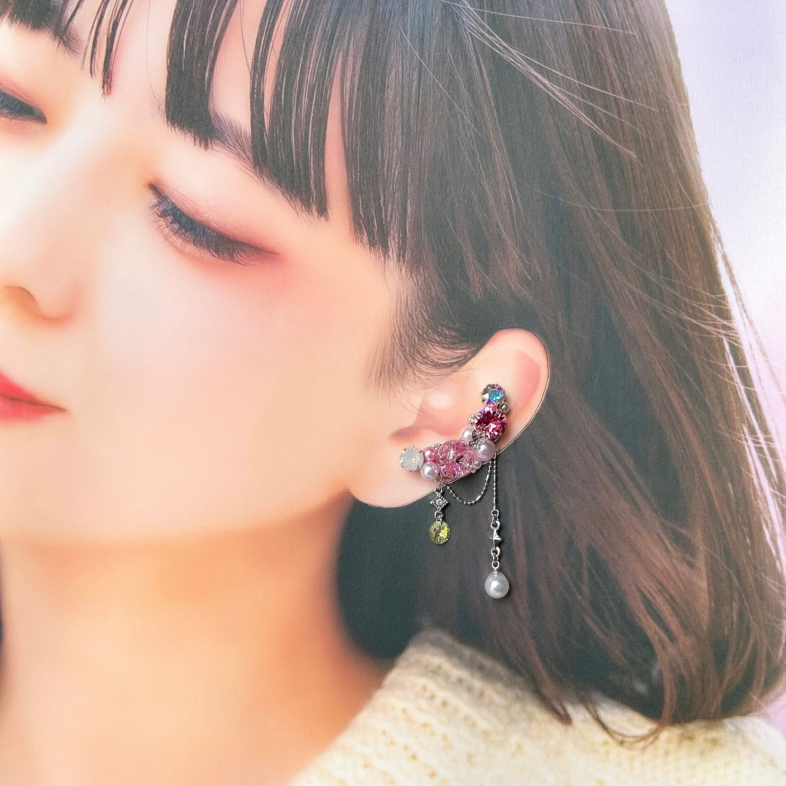 華やかなビジューデザインが魅力のハンドメイドイヤーカフ2点セットです。樹脂粘土パーツやスワロフスキー・クリスタルのダイヤカットストーン、パール、オリジナルのレジンパーツを贅沢に組み合わせ、耳元をエレガントに彩ります。