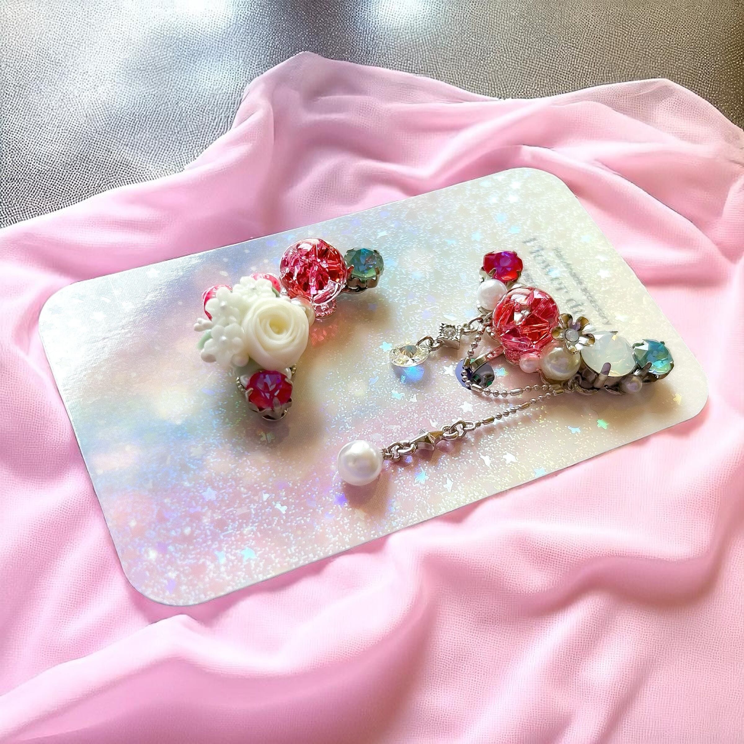 華やかなビジューデザインが魅力のハンドメイドイヤーカフ2点セットです。樹脂粘土パーツやスワロフスキー・クリスタルのダイヤカットストーン、パール、オリジナルのレジンパーツを贅沢に組み合わせ、耳元をエレガントに彩ります。