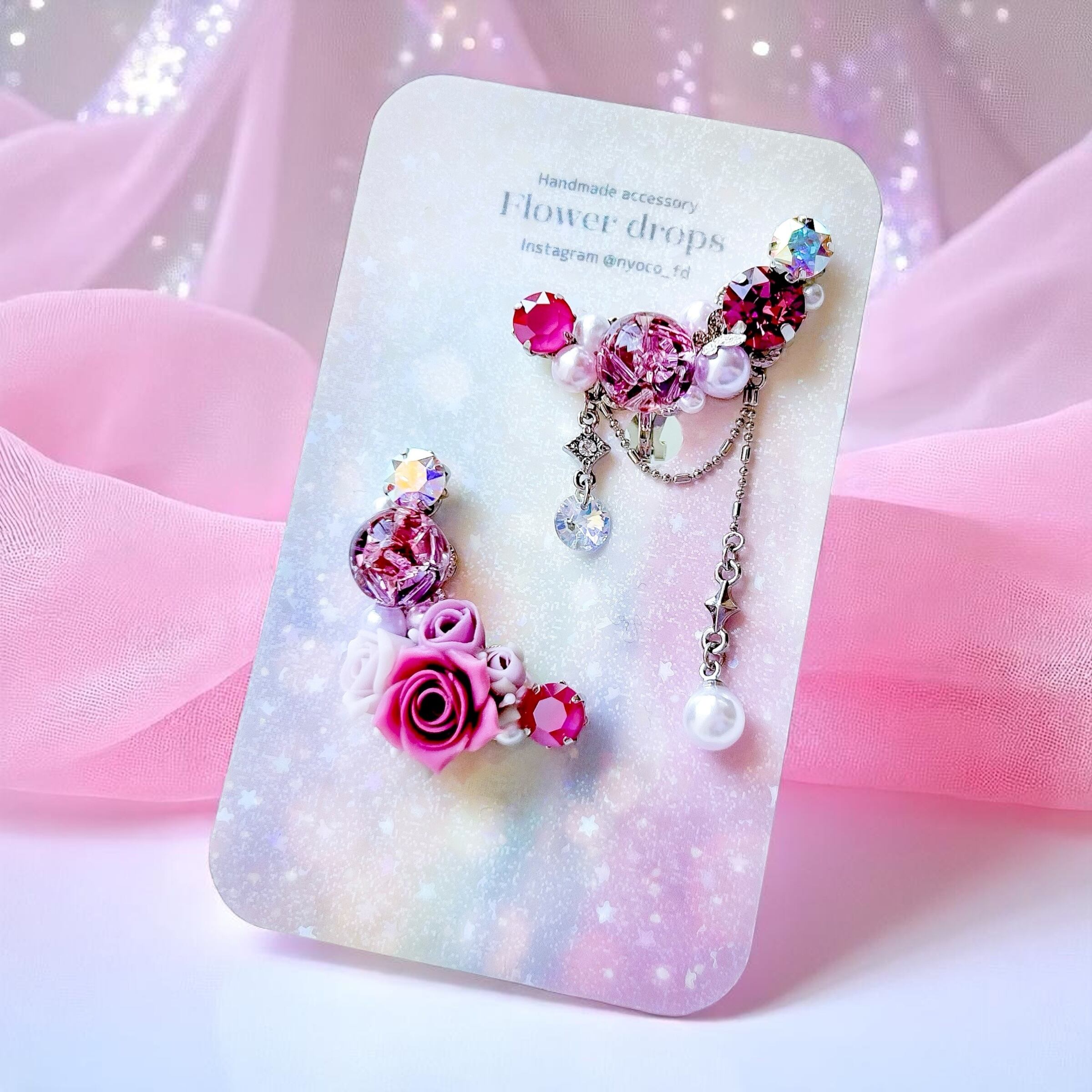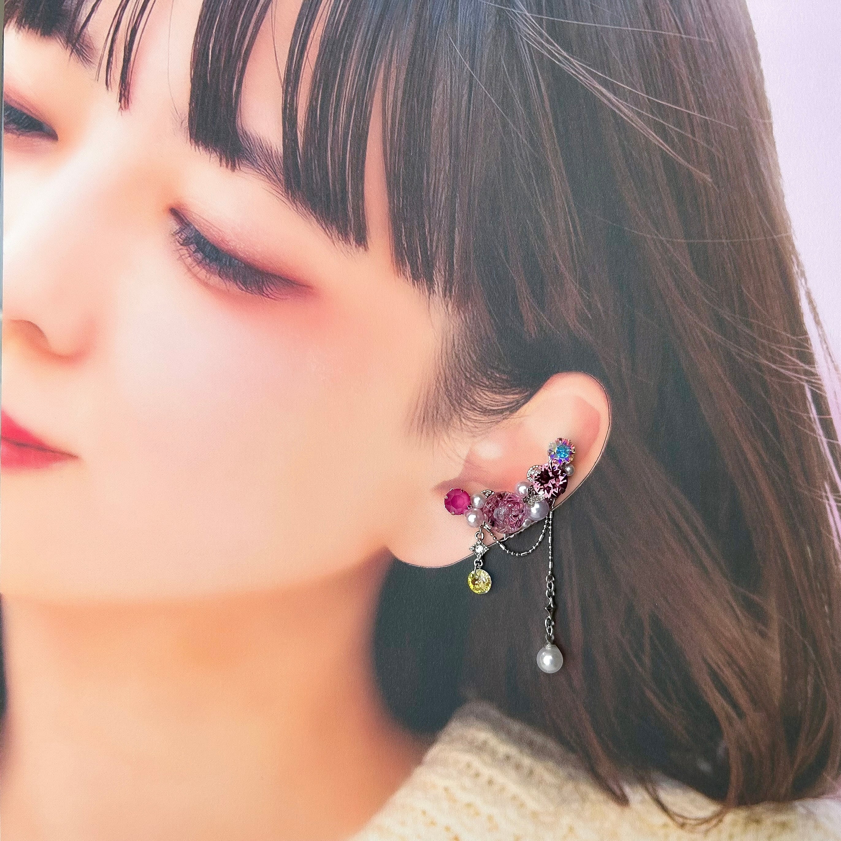 華やかなビジューデザインが魅力のハンドメイドイヤーカフ2点セットです。樹脂粘土パーツやスワロフスキー・クリスタルのダイヤカットストーン、パール、オリジナルのレジンパーツを贅沢に組み合わせ、耳元をエレガントに彩ります。