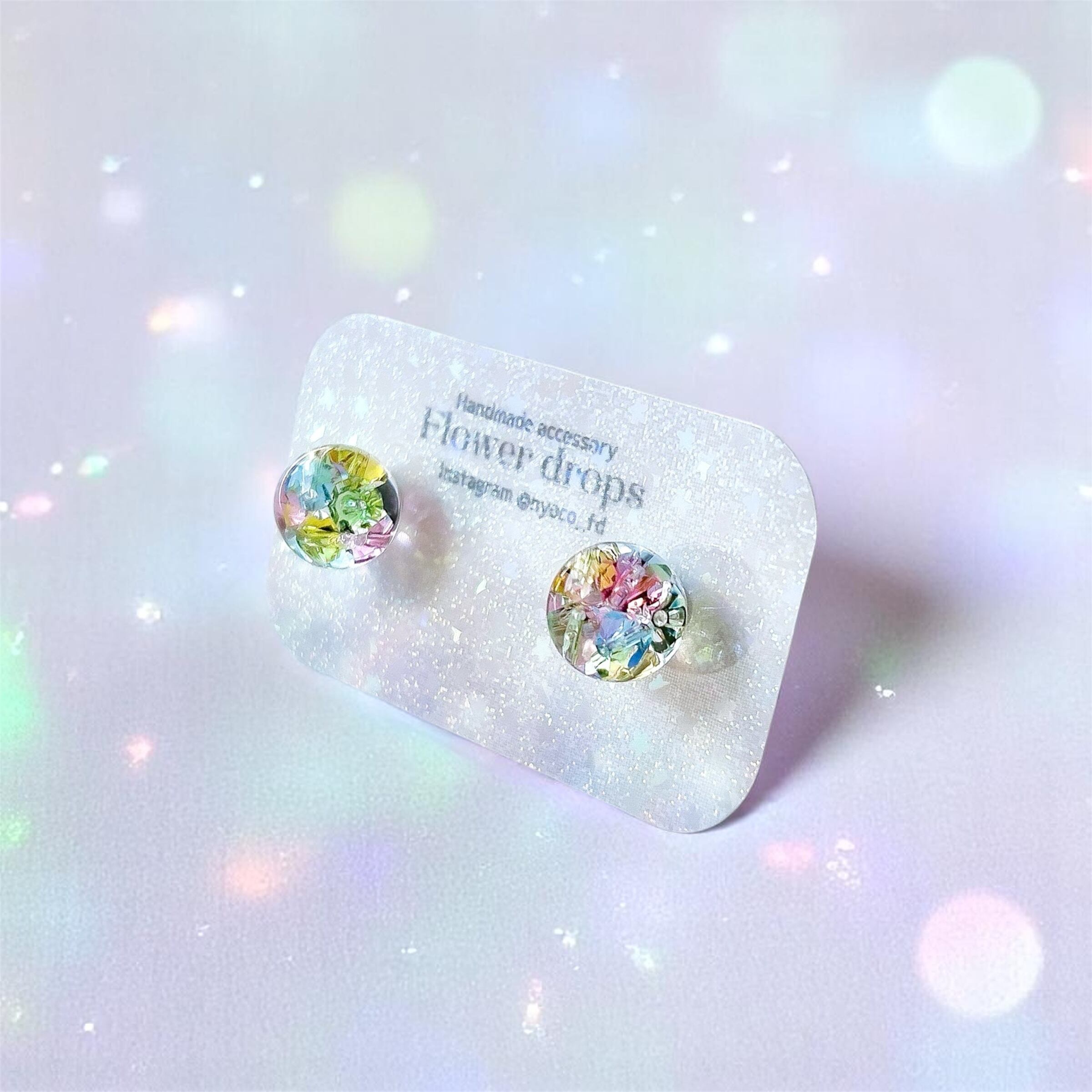 レジンの中にたっぷりと閉じ込めたスワロフスキー・クリスタルビーズが、光を受けてキラキラと輝くピアスです。