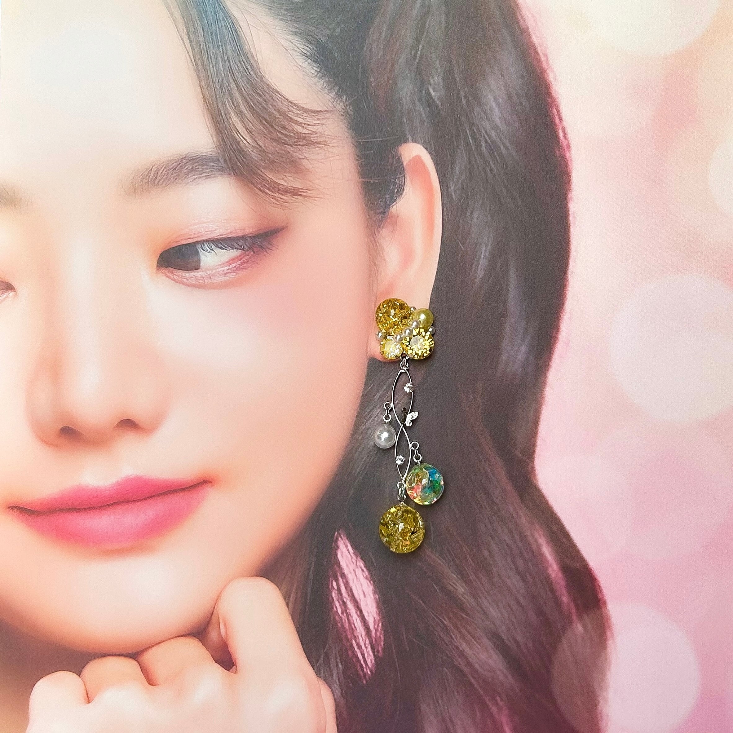 大粒のスワロフスキー・クリスタルやパールを贅沢にあしらい、華やかなビジューデザインに仕上げました。ドーム型レジンには、スワロフスキー・クリスタルビーズを閉じ込め、揺れるたびにきらめく特別な輝きを演出します。一つ一つ手作業で作られたオリジナルパーツが、唯一無二の美しさを生み出します。上品な華やかさを添える、特別なアクセサリーです。
