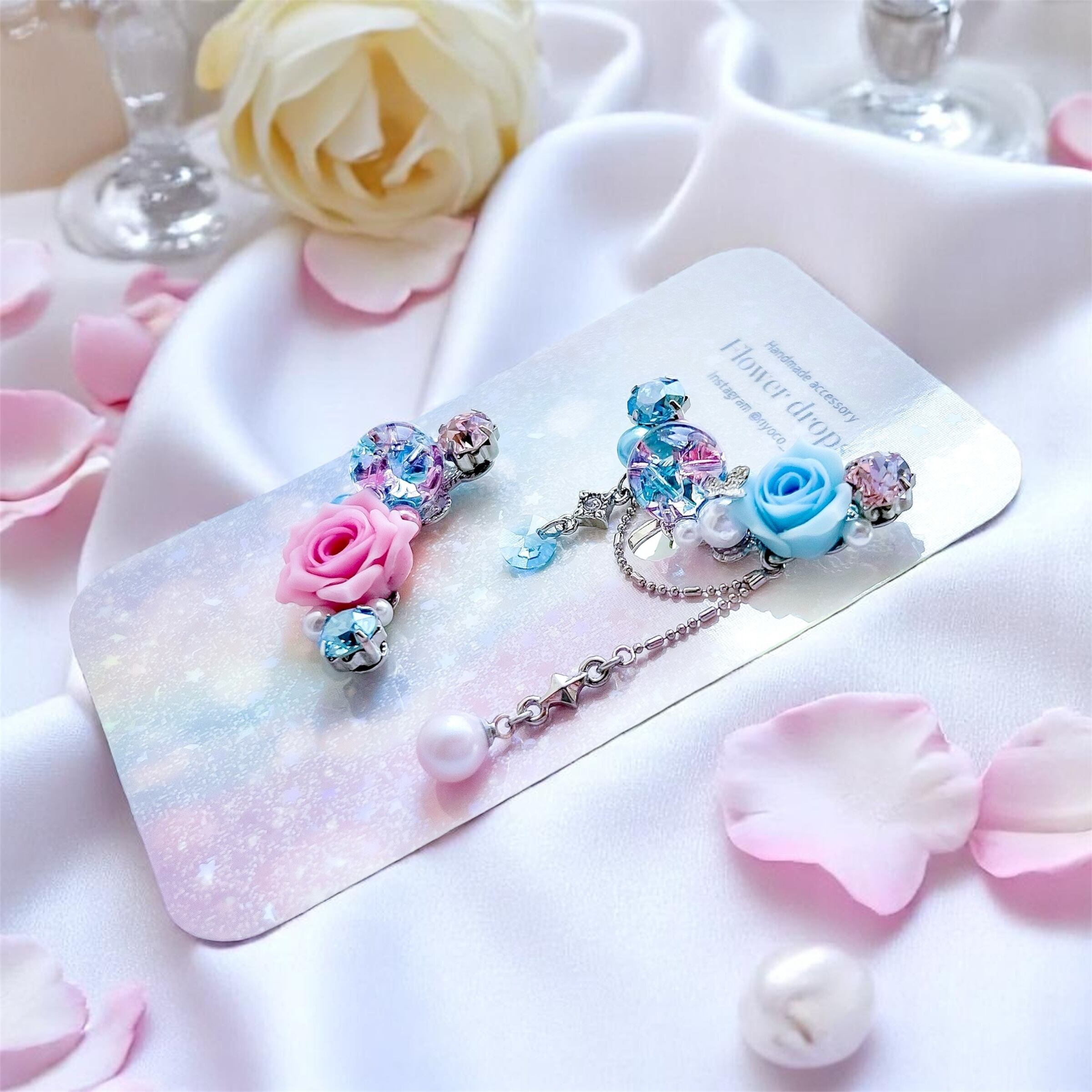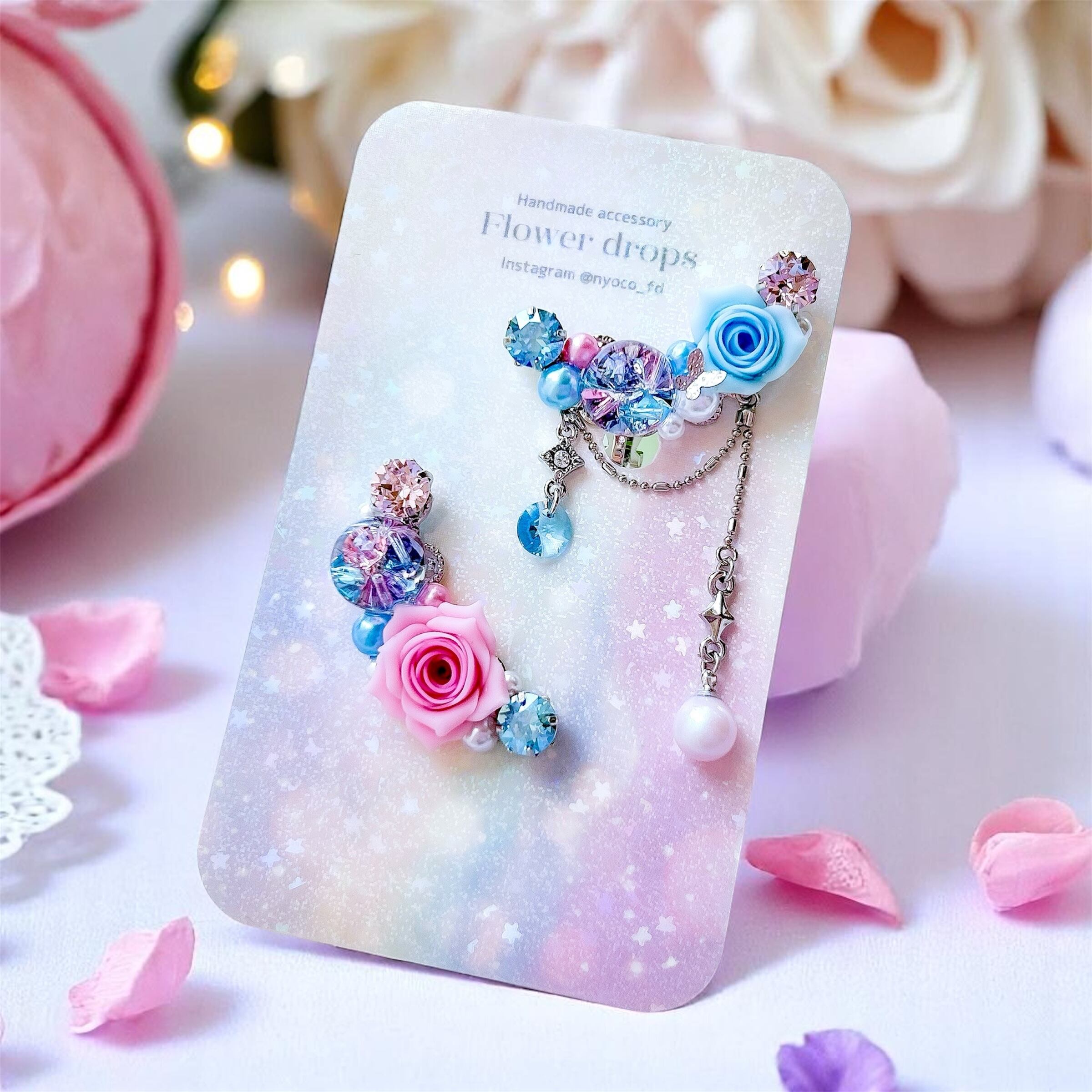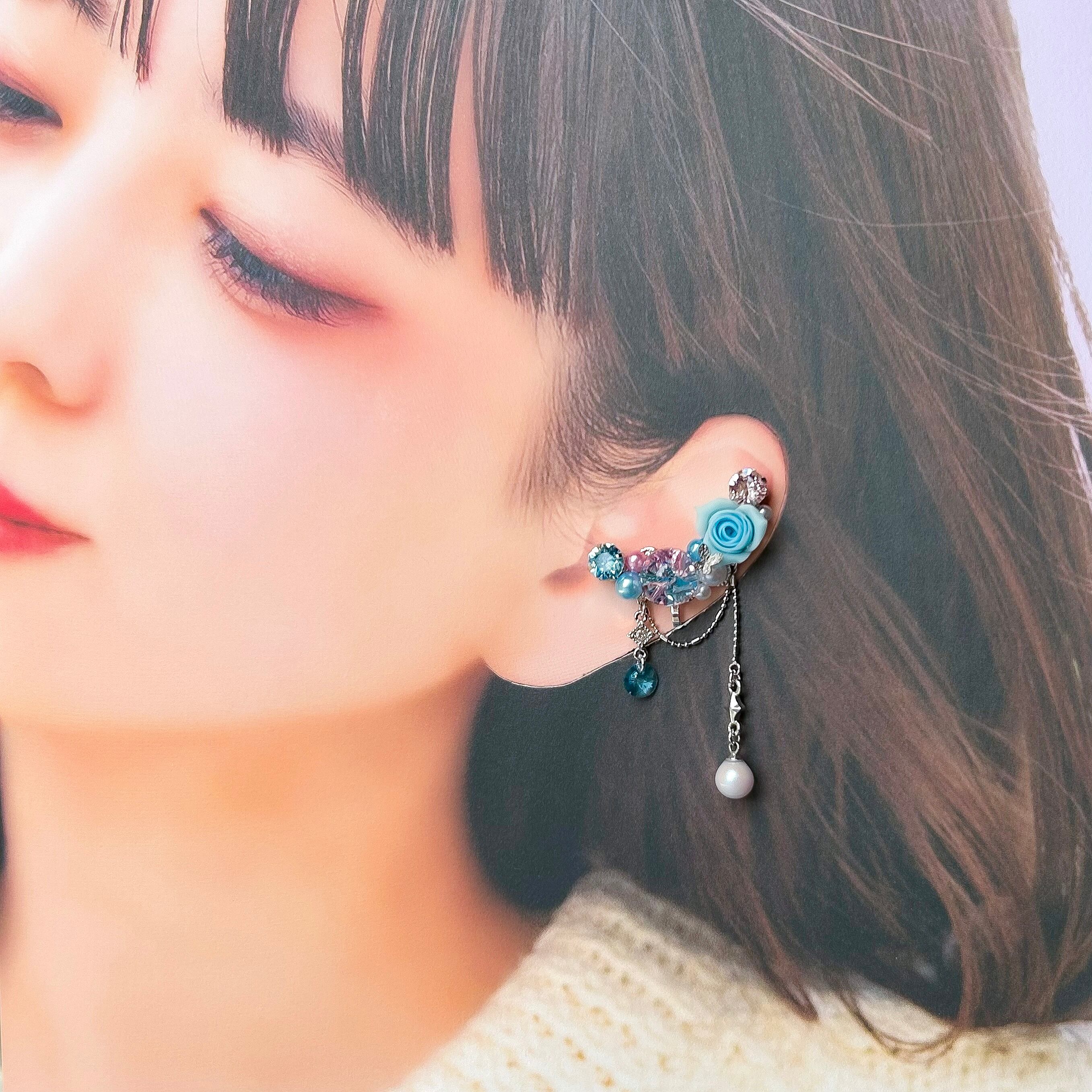 クレイフラワーとクリスタルドームビジューのイヤーカフ(ローズ/水色・ピンク)
