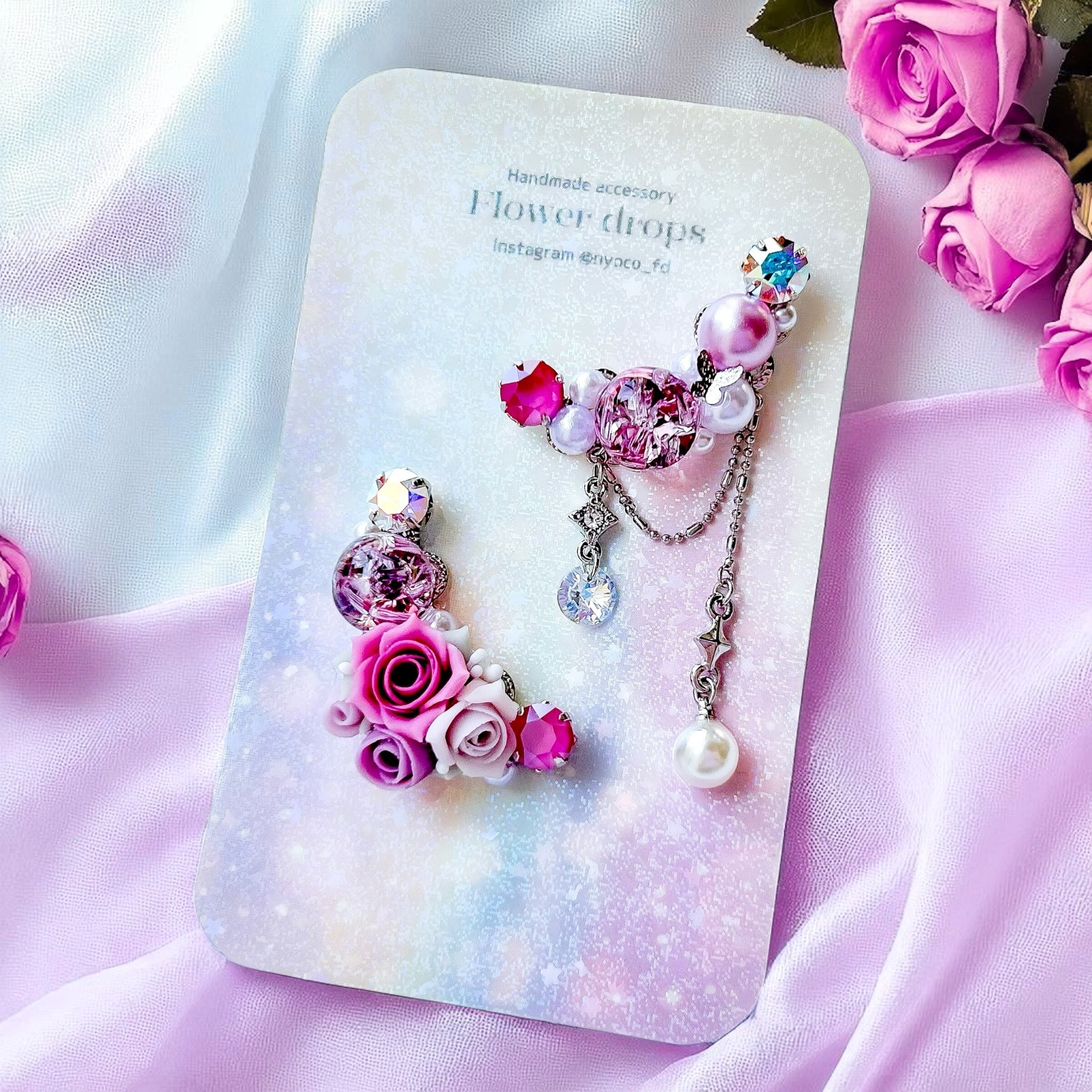 華やかなビジューデザインが魅力のハンドメイドイヤーカフ2点セットです。樹脂粘土パーツやスワロフスキー・クリスタルのダイヤカットストーン、パール、オリジナルのレジンパーツを贅沢に組み合わせ、耳元をエレガントに彩ります。
