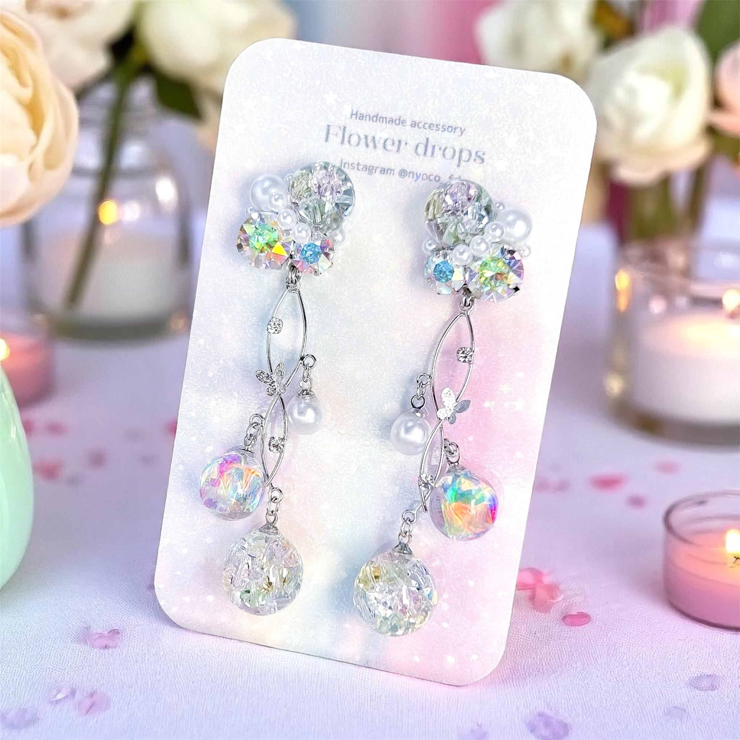 大粒のスワロフスキー・クリスタルやパールを贅沢にあしらい、華やかなビジューデザインに仕上げました。ドーム型レジンには、スワロフスキー・クリスタルビーズを閉じ込め、揺れるたびにきらめく特別な輝きを演出します。一つ一つ手作業で作られたオリジナルパーツが、唯一無二の美しさを生み出します。上品な華やかさを添える、特別なアクセサリーです。