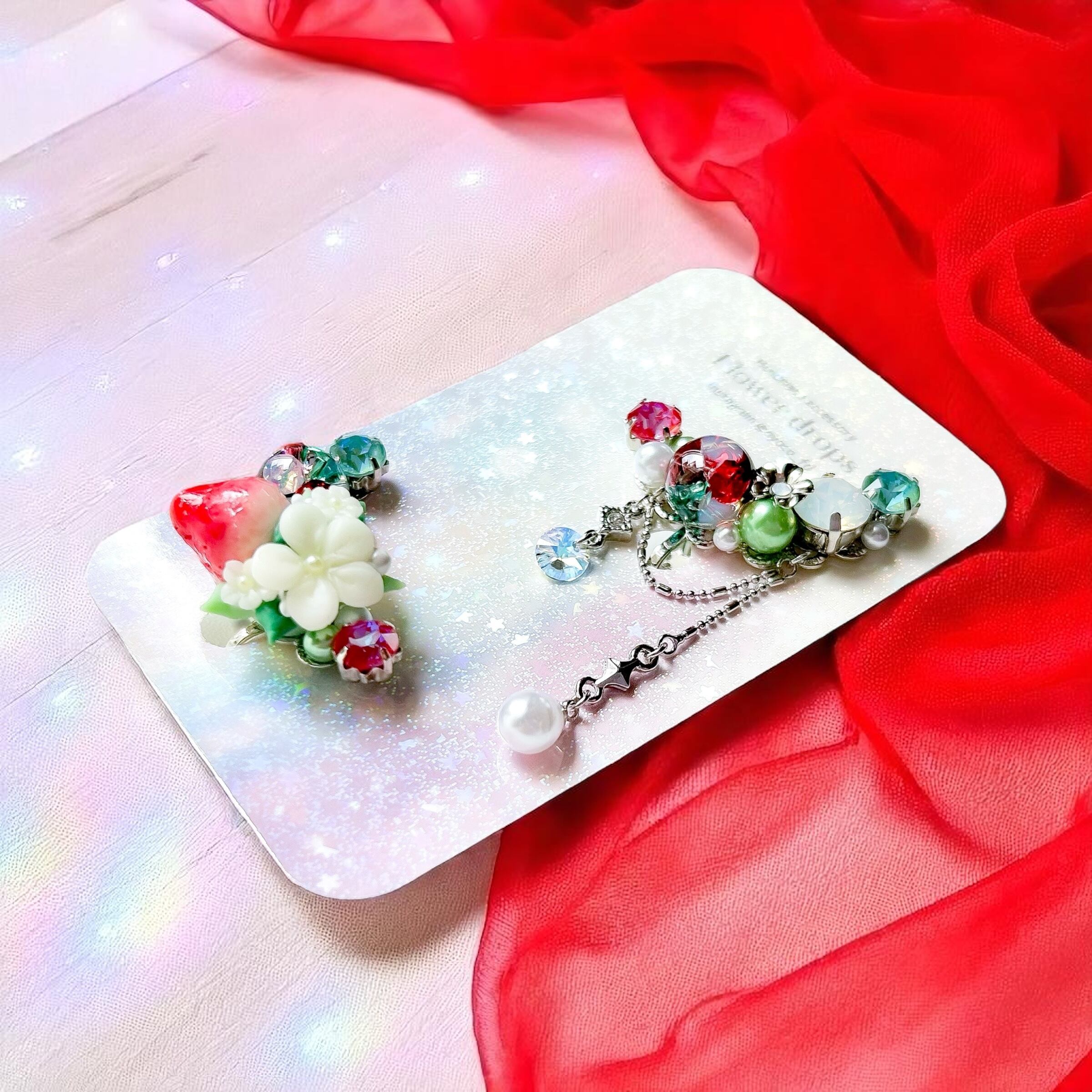 クレイフラワーとクリスタルドームビジューのイヤーカフ(いちご/レッド・グリーン)