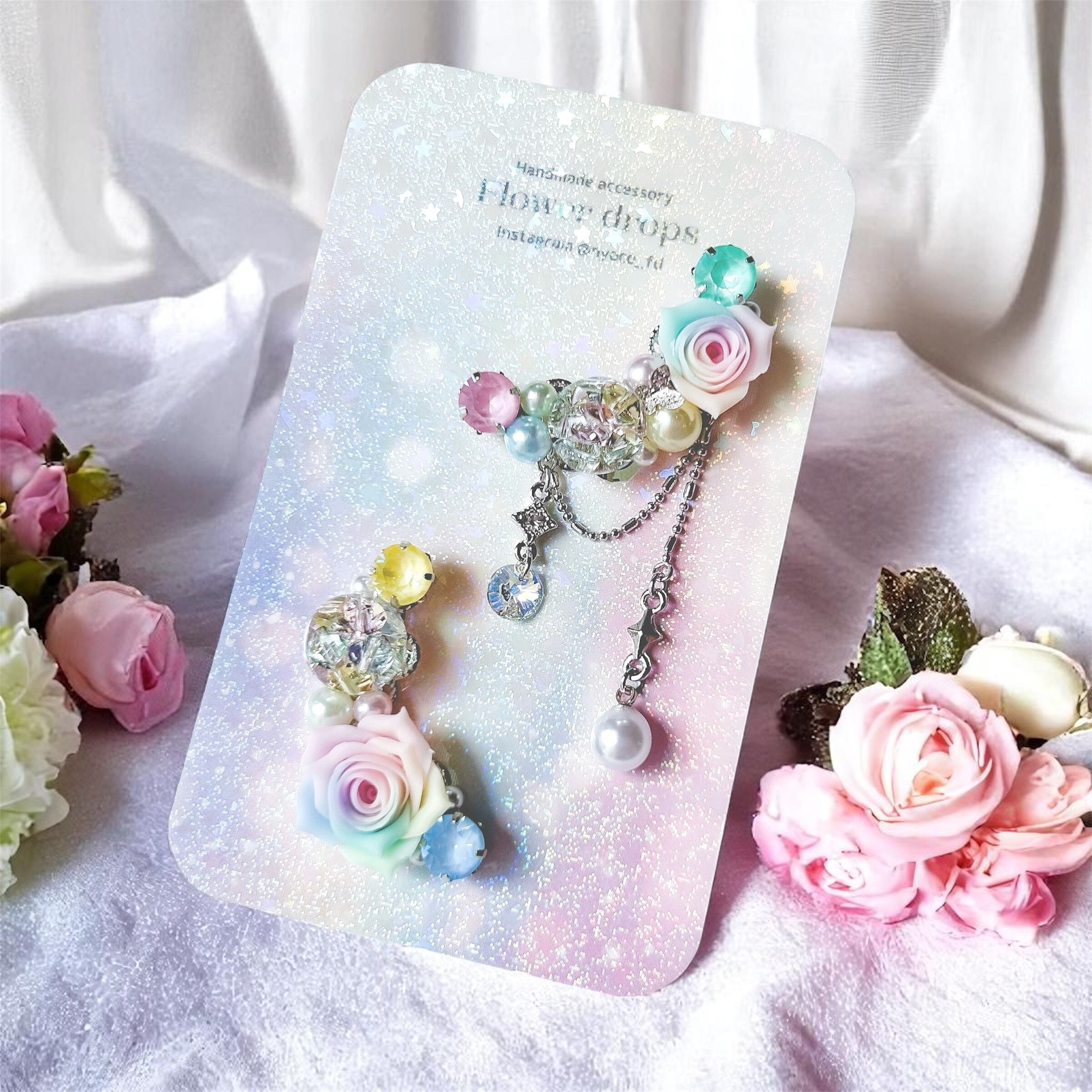 華やかなビジューデザインが魅力のハンドメイドイヤーカフ2点セットです。樹脂粘土パーツやスワロフスキー・クリスタルのダイヤカットストーン、パール、オリジナルのレジンパーツを贅沢に組み合わせ、耳元をエレガントに彩ります。