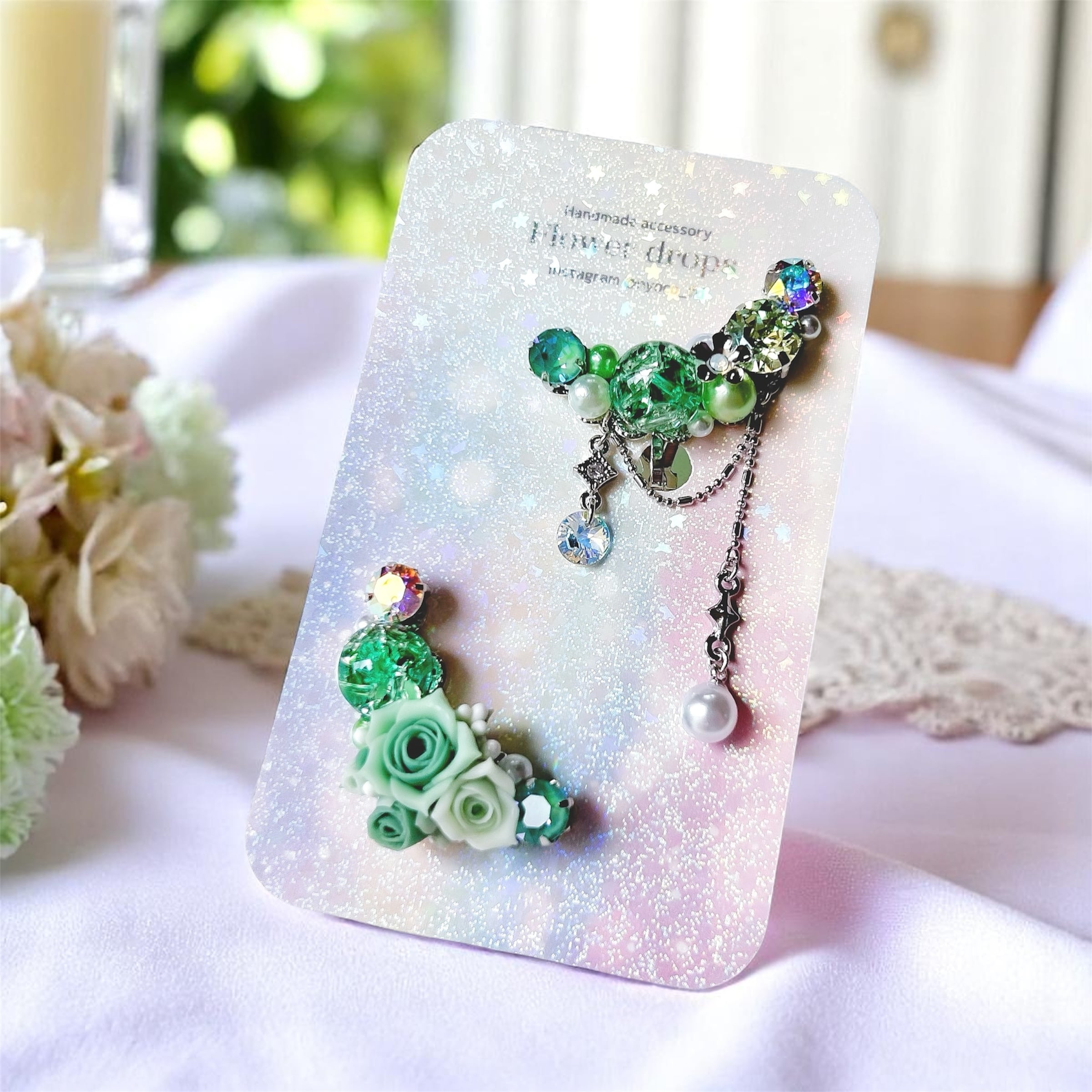 クレイフラワーとクリスタルドームビジューのイヤーカフ(ローズ/グリーン)