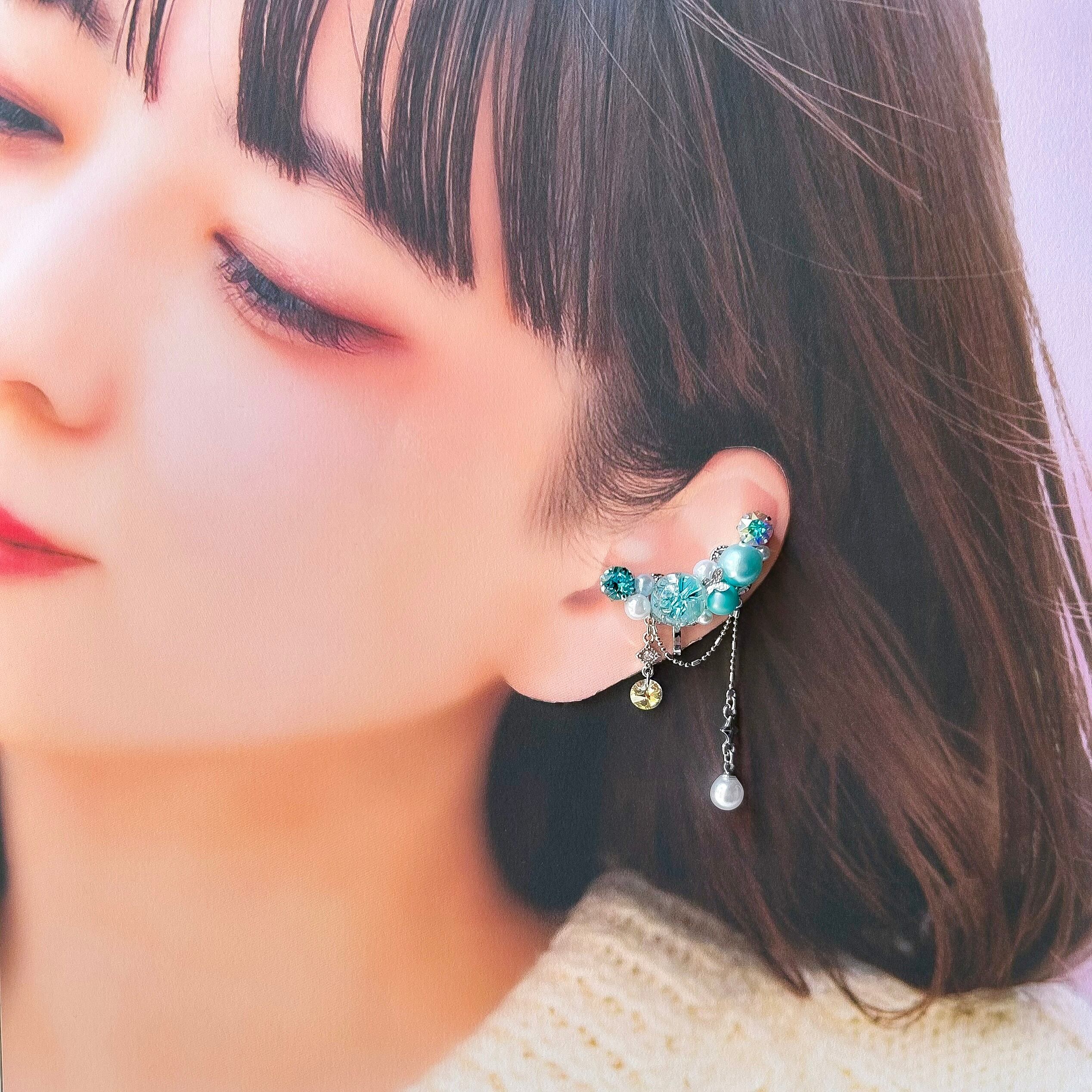 華やかなビジューデザインが魅力のハンドメイドイヤーカフ2点セットです。樹脂粘土パーツやスワロフスキー・クリスタルのダイヤカットストーン、パール、オリジナルのレジンパーツを贅沢に組み合わせ、耳元をエレガントに彩ります。