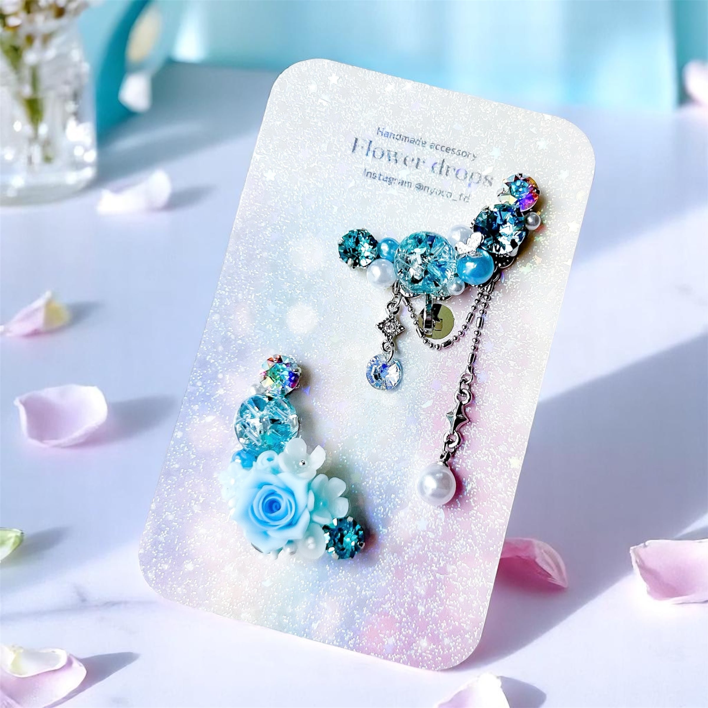 クレイフラワーとクリスタルドームビジューのイヤーカフ(ローズ/水色・ターコイズ)