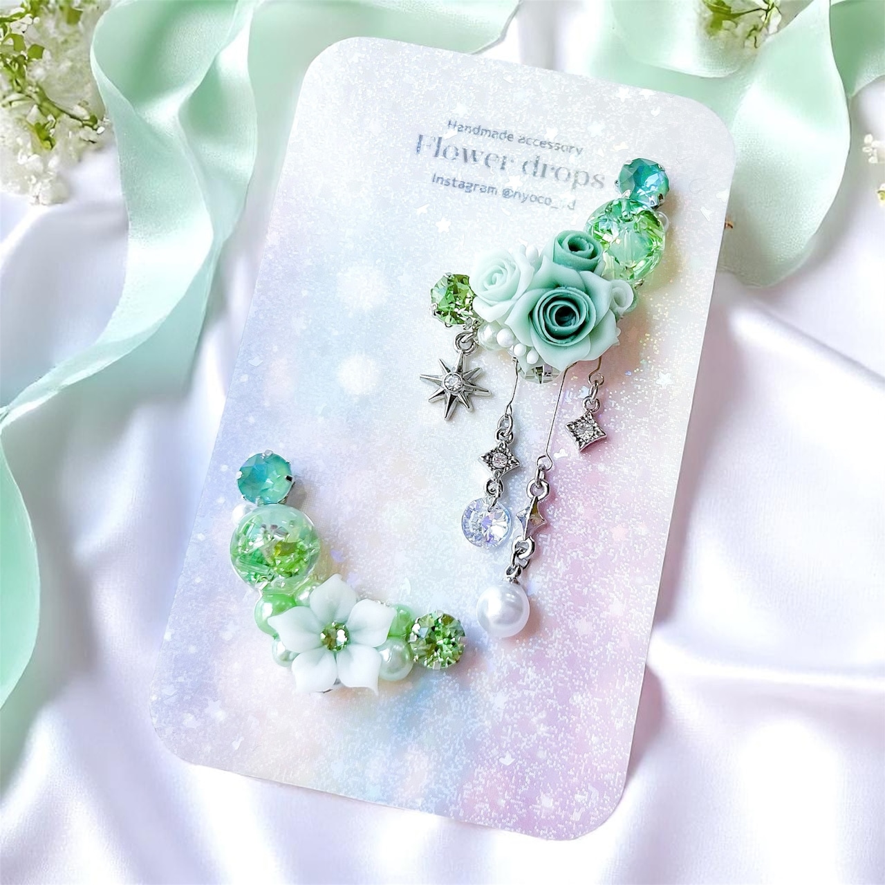 クリスタルドームビジュー♥クレイフラワーのイヤーカフ(ローズ/グリーン)