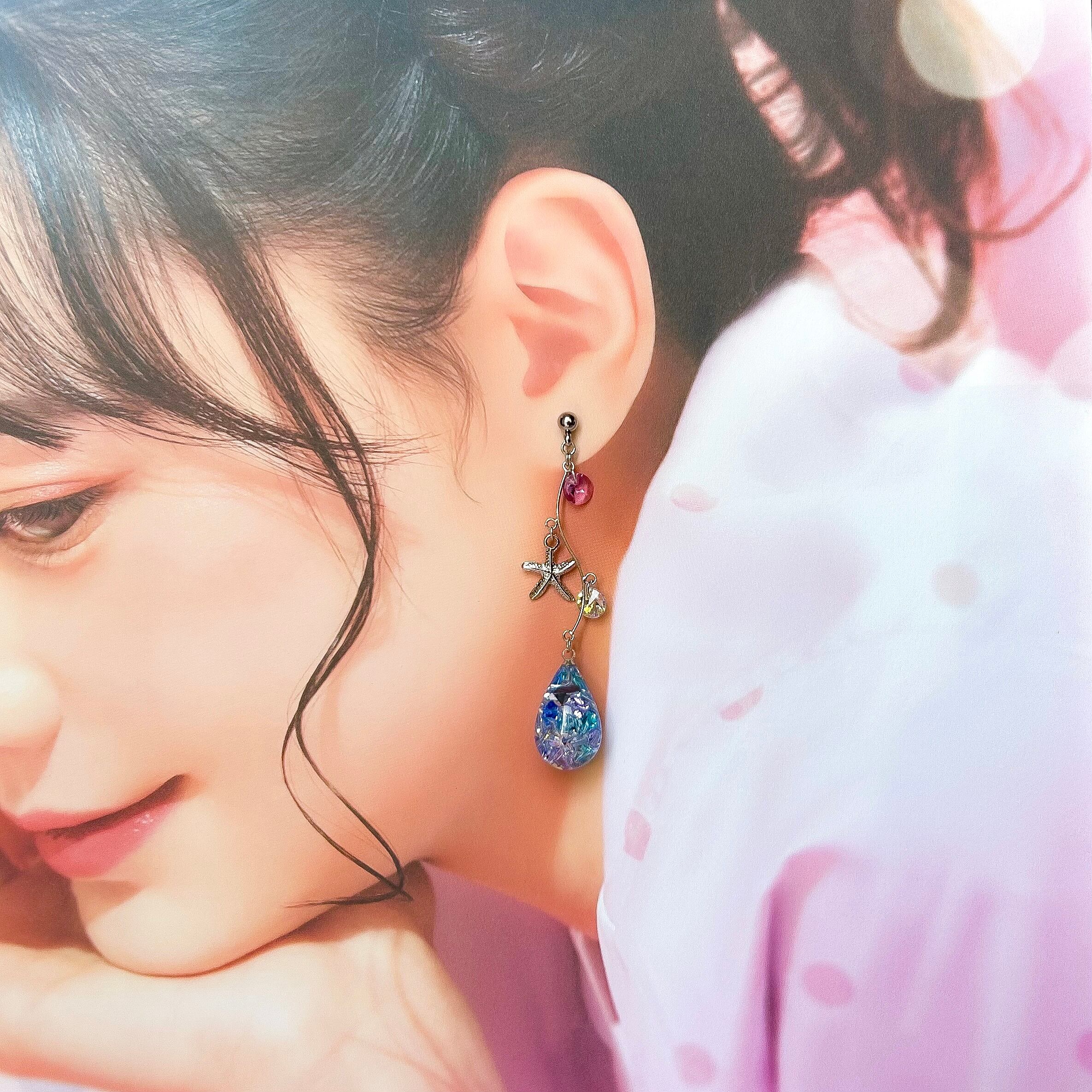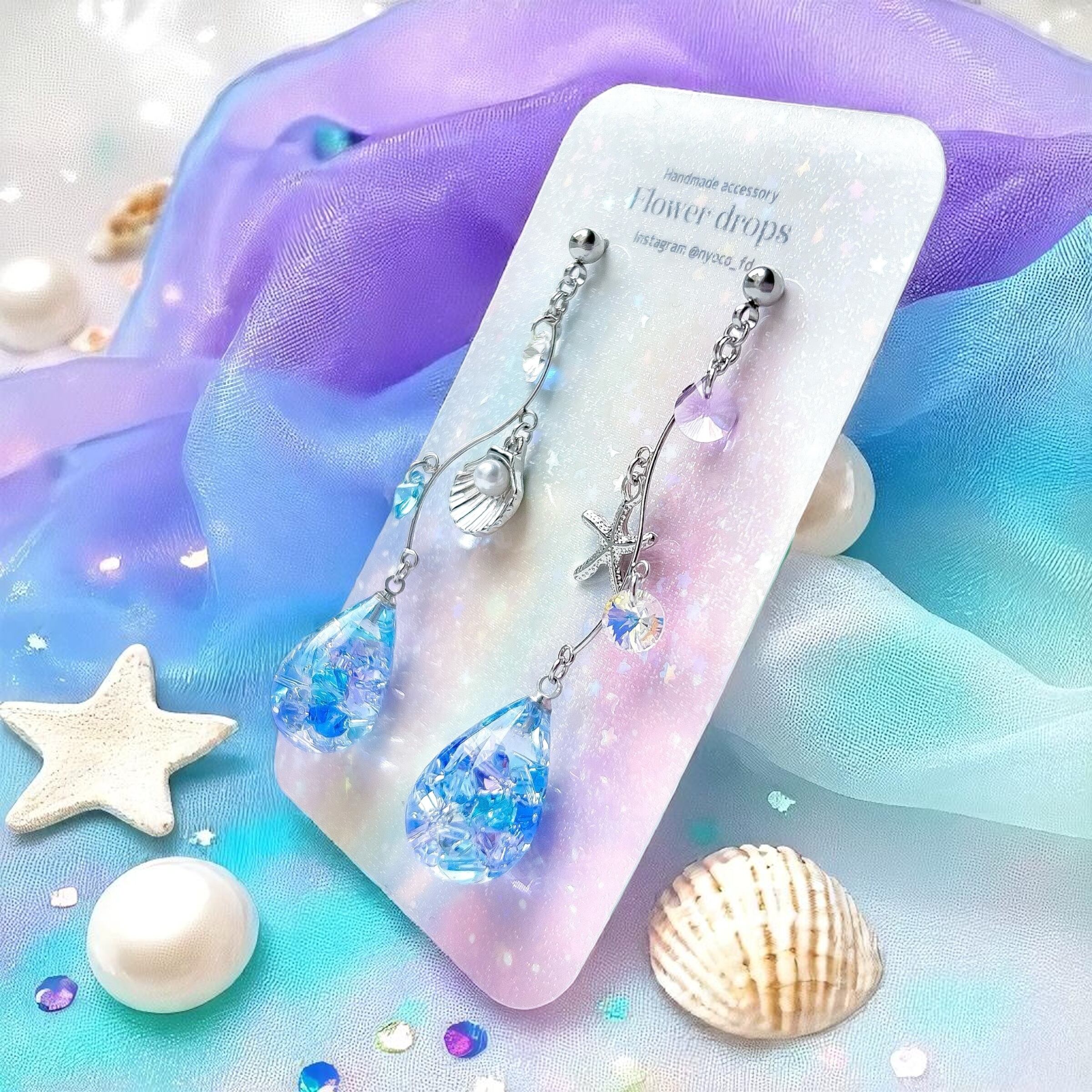 しずく型のレジンにスワロフスキー・クリスタルのビーズをぎゅっと詰め込み、シェルやヒトデのチャームを合わせて幻想的な海のきらめきを閉じ込めたようなデザインの仕上げました。夏のコーデや推し活コーデにもぴったりな、華やかで涼しげなアイテムです。