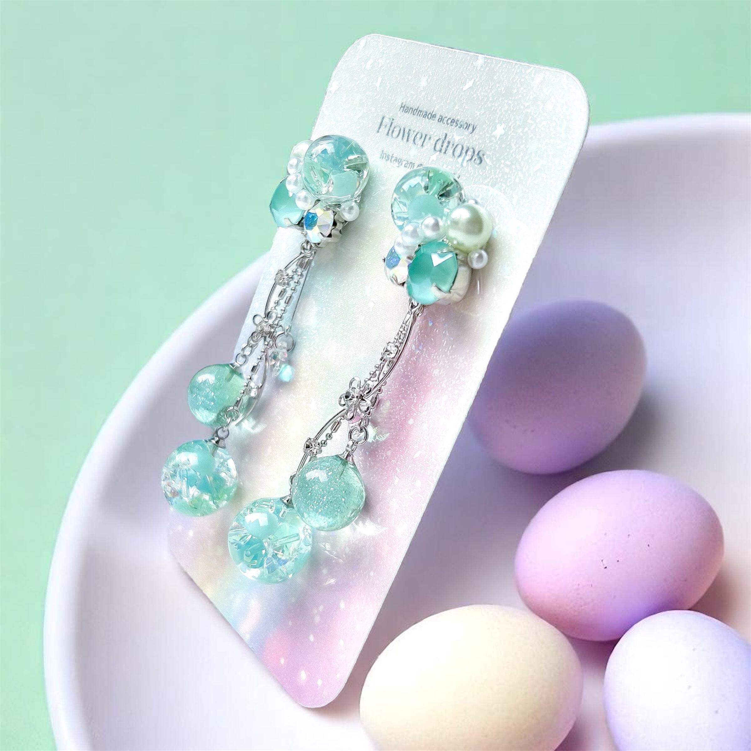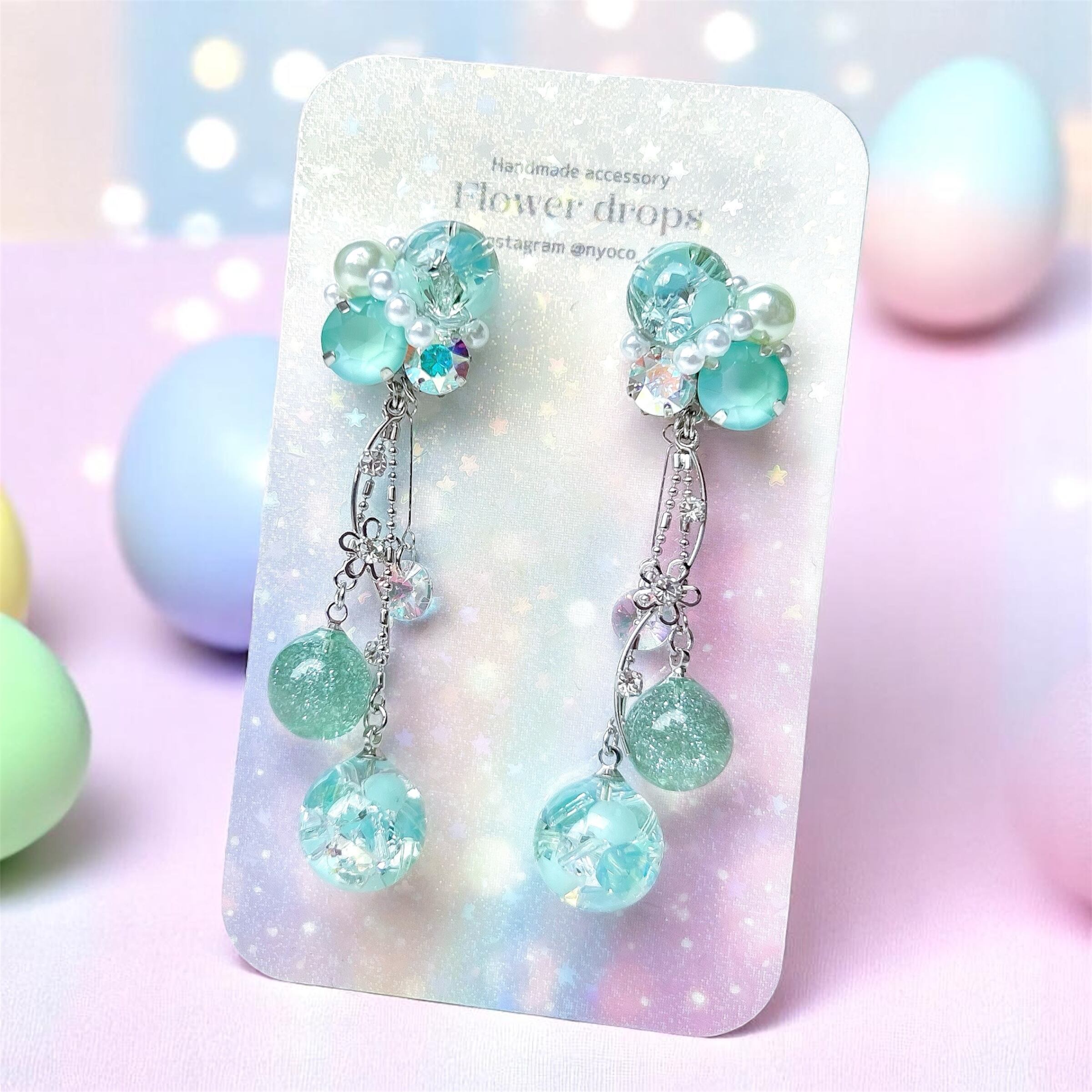 クリスタルドームビジュー♥フラワーチャームの耳飾り(ミントグリーン)