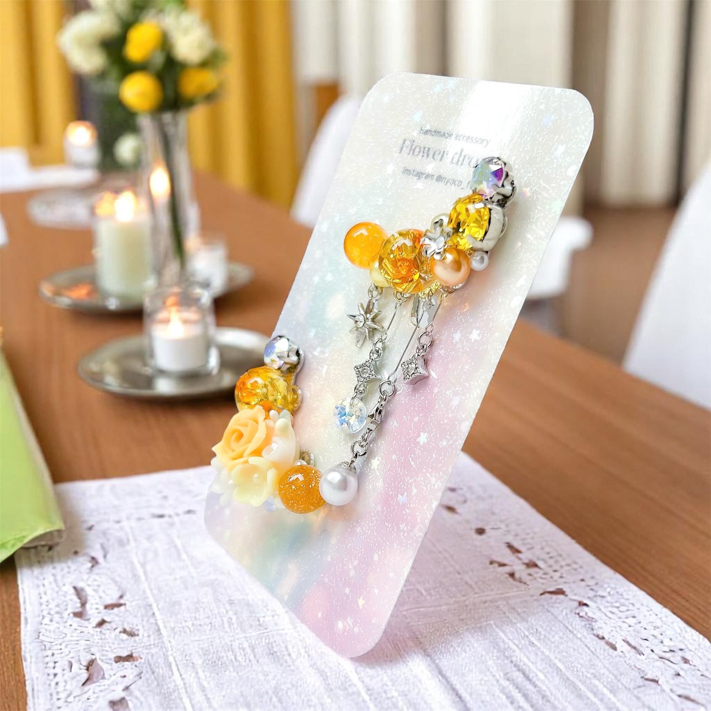 華やかなビジューデザインが魅力のハンドメイドイヤーカフ2点セットです。樹脂粘土パーツやスワロフスキー・クリスタルのダイヤカットストーン、パール、オリジナルのレジンパーツを贅沢に組み合わせ、耳元をエレガントに彩ります。