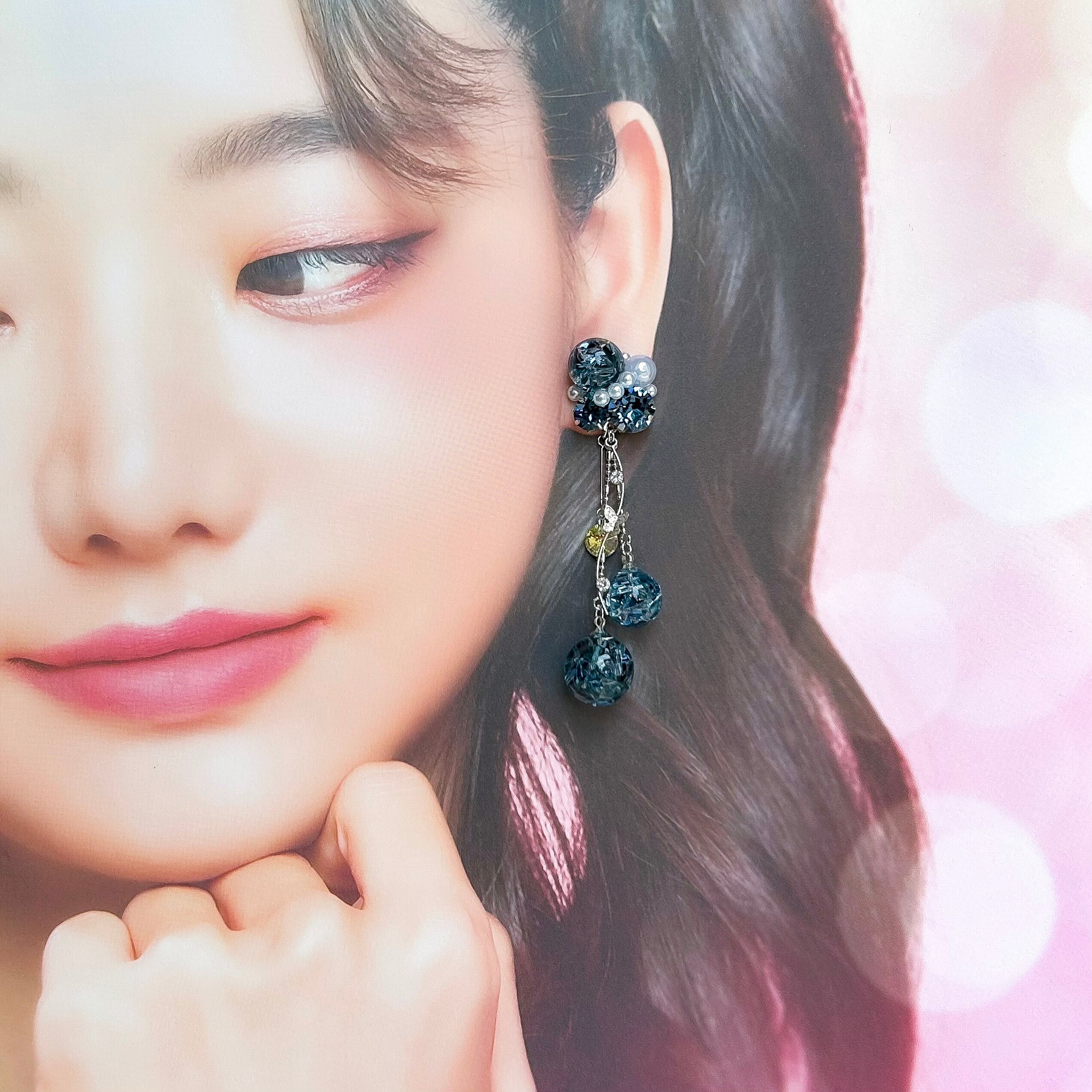 クリスタルドームビジュー♥バタフライチャームの耳飾り(デニムブルー)