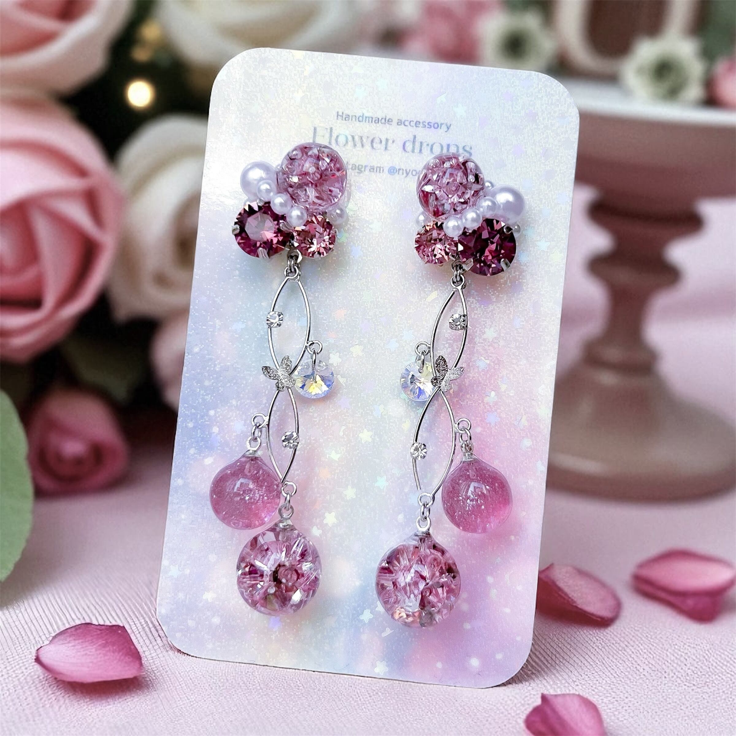 クリスタルドームビジュー♥バタフライチャームの耳飾り(アンティークピンク)