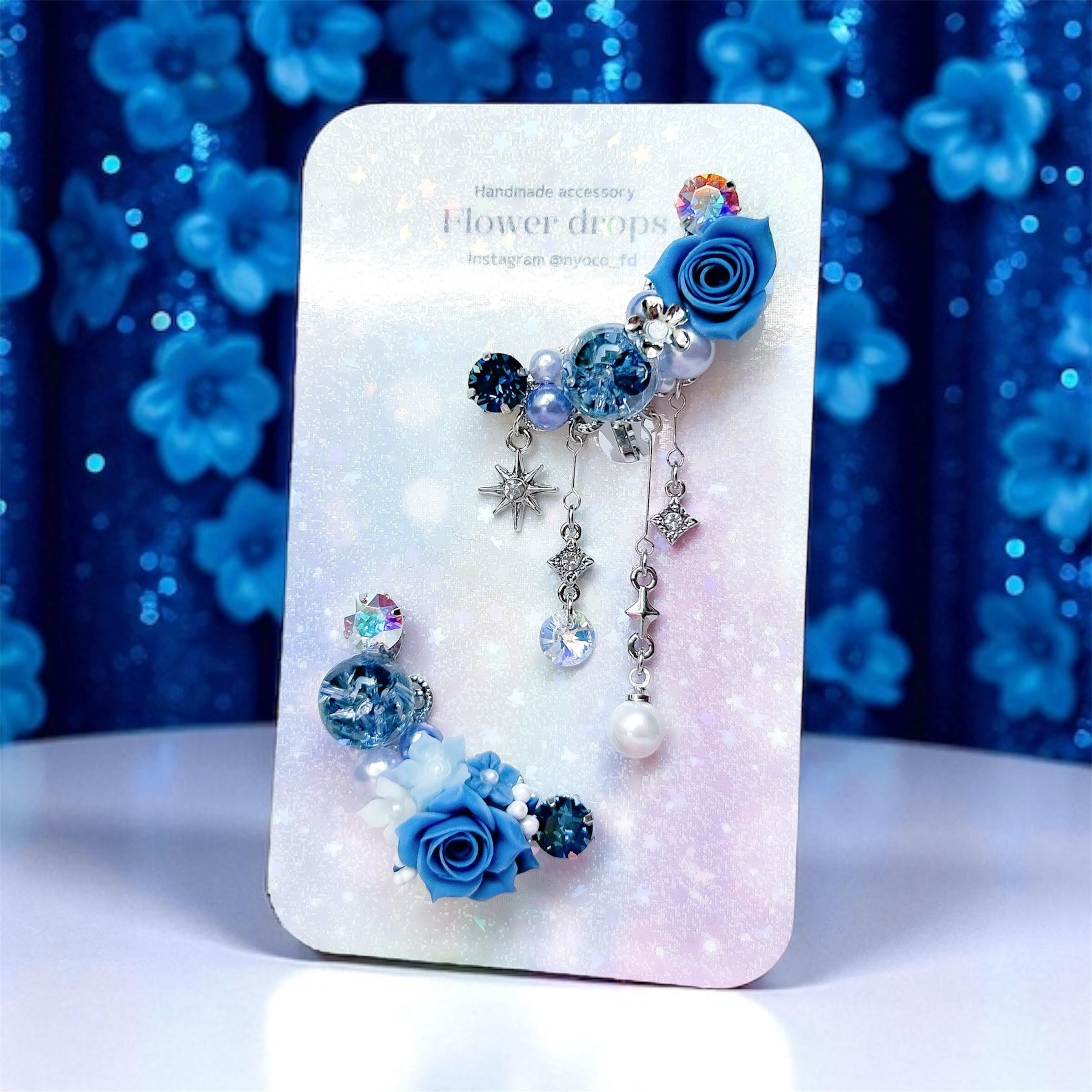 クリスタルドームビジュー♥クレイフラワーのイヤーカフ(ローズ/デニムブルー)