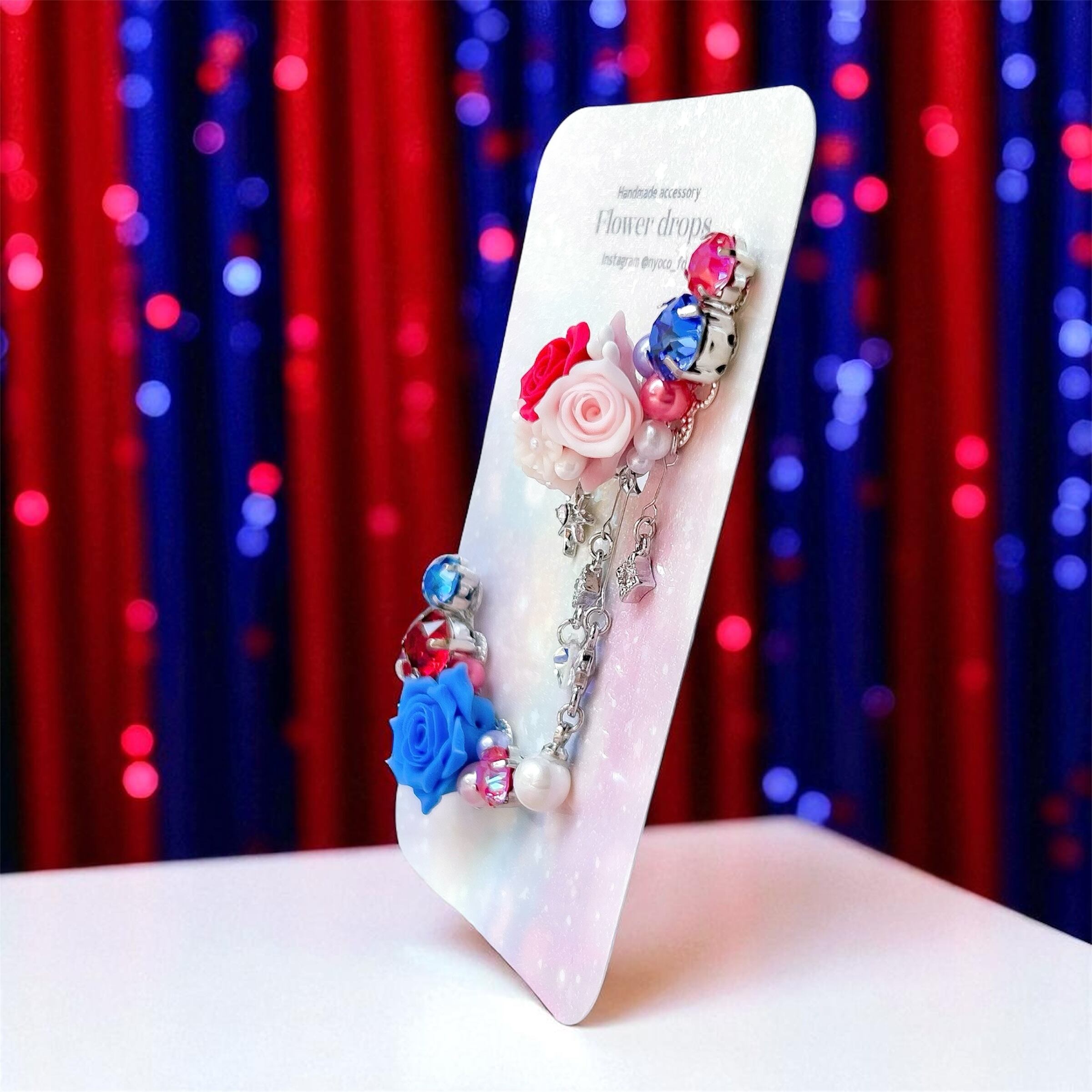 クレイフラワーとビジューのイヤーカフ(レッド・ブルー)