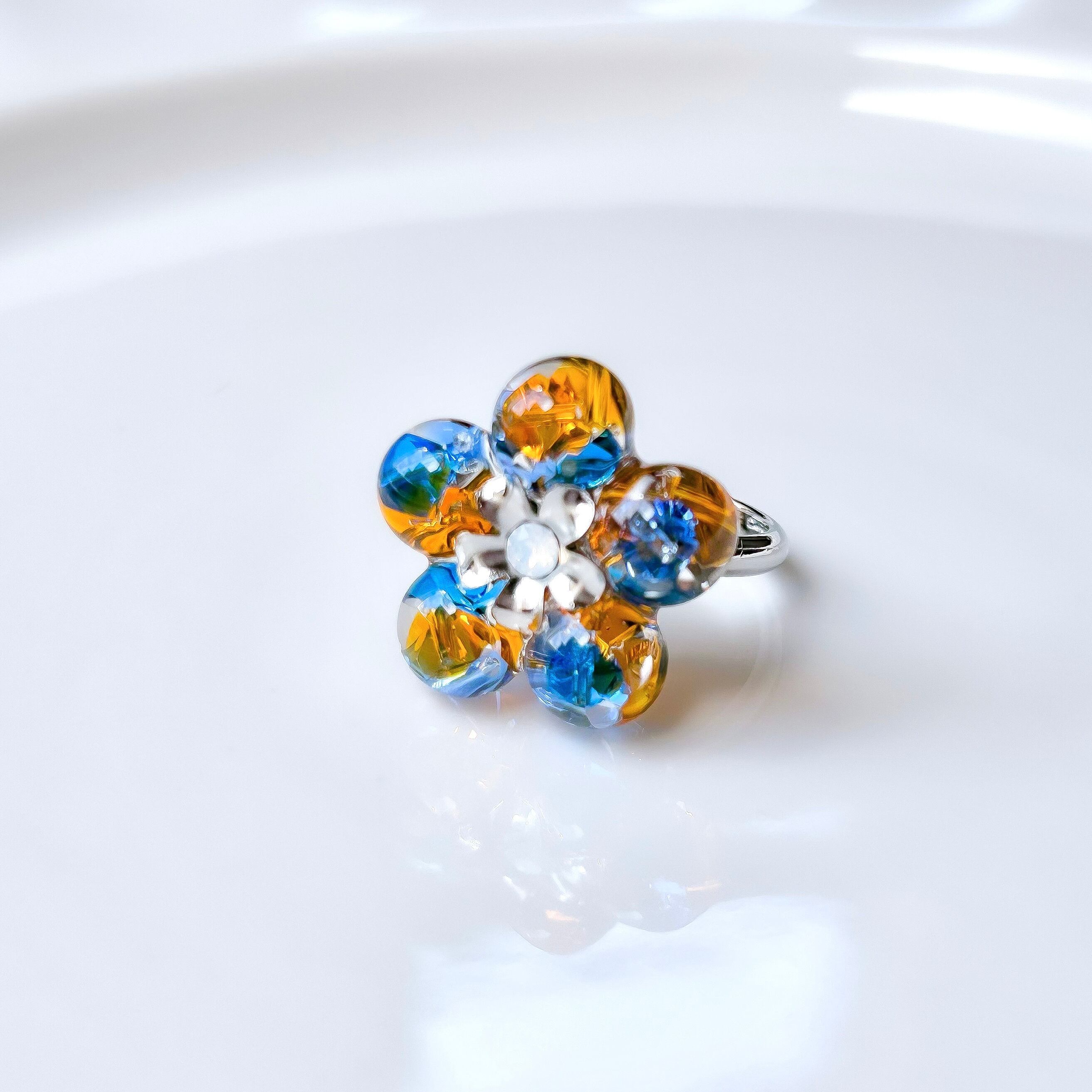 クリスタルドームフラワーの指輪(オレンジ・青)