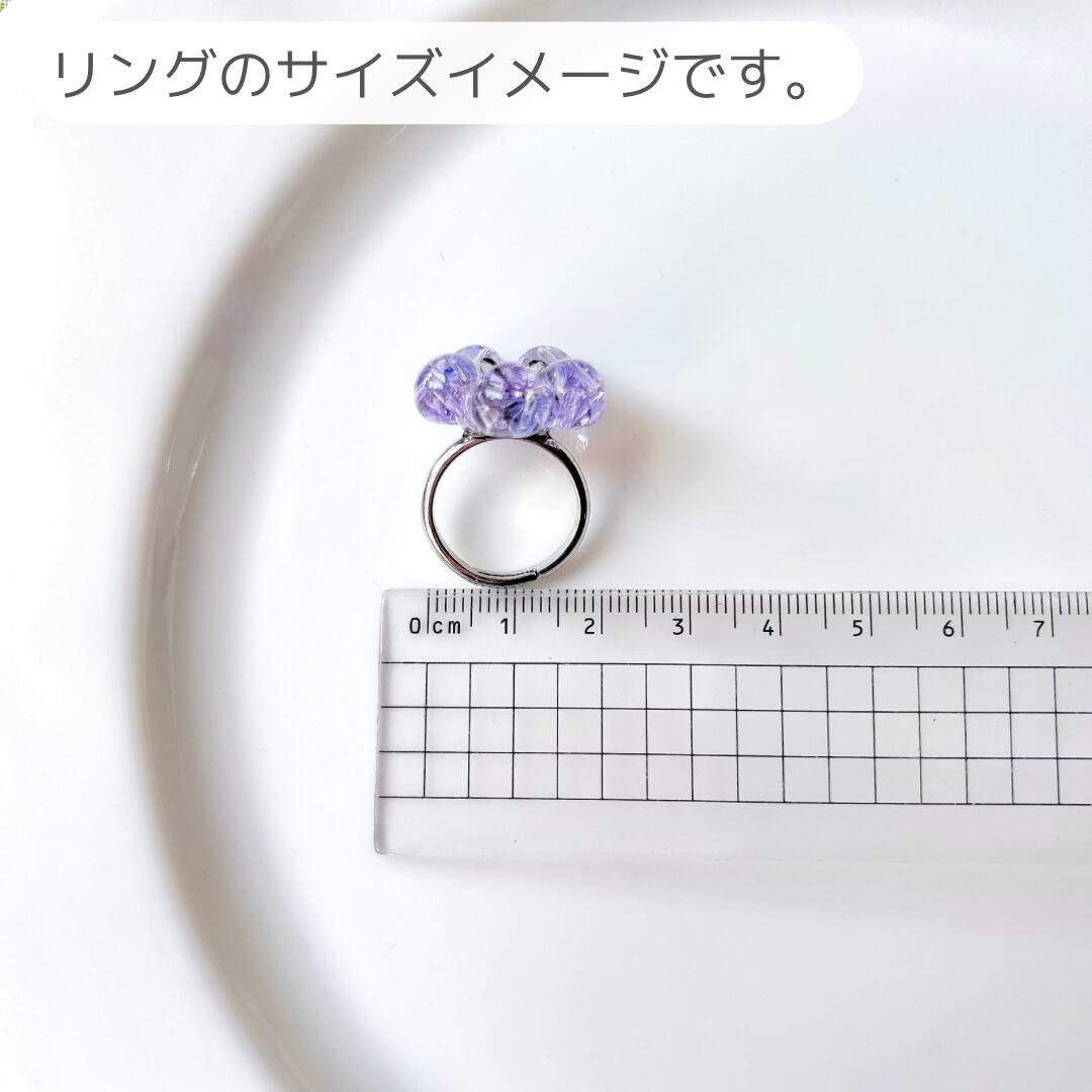 キラキラと光を反射するドーム型パーツをお花の形に並べた、涼やかで華やかなハンドメイドリングです。