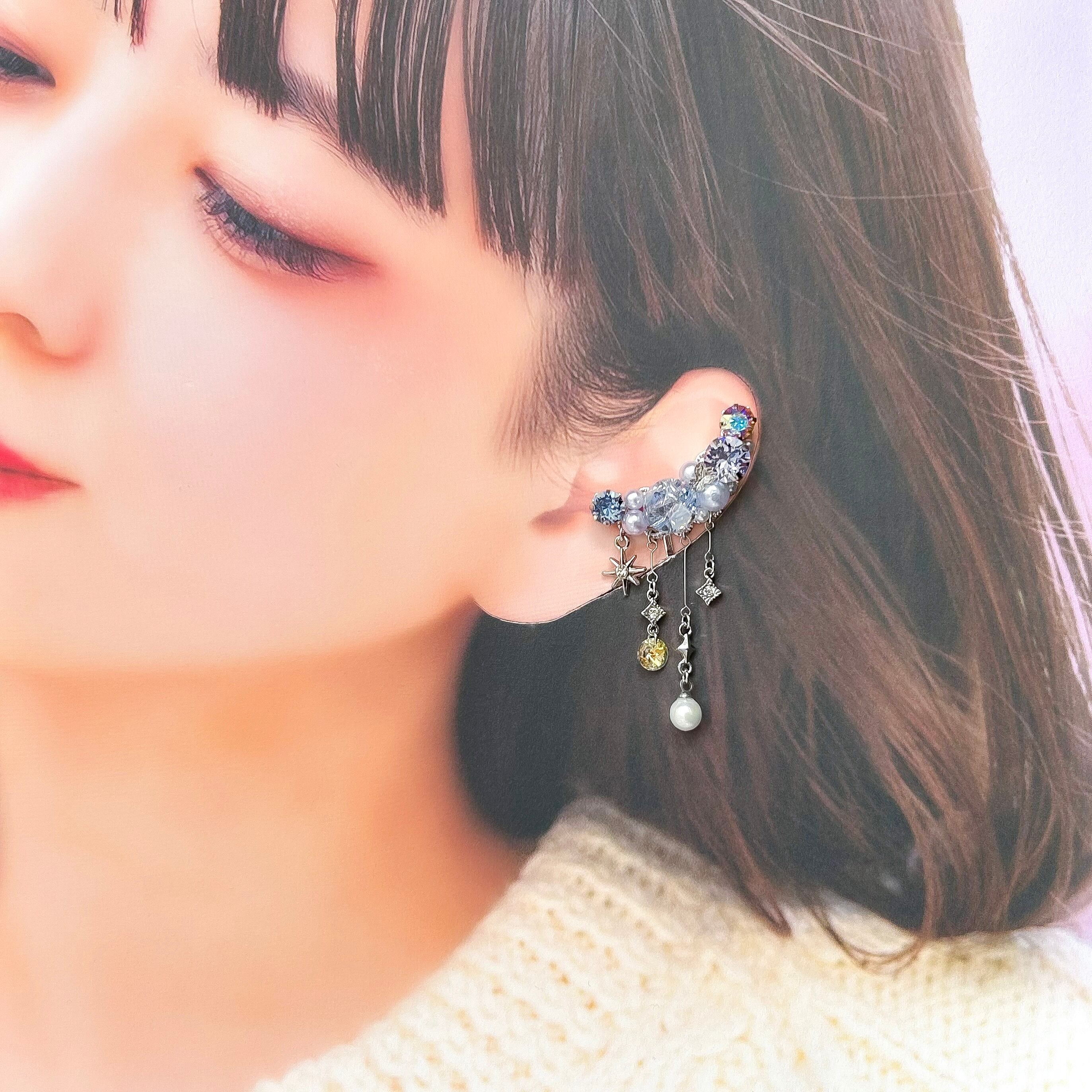 華やかなビジューデザインが魅力のハンドメイドイヤーカフ2点セットです。樹脂粘土パーツやスワロフスキー・クリスタルのダイヤカットストーン、パール、オリジナルのレジンパーツを贅沢に組み合わせ、耳元をエレガントに彩ります。