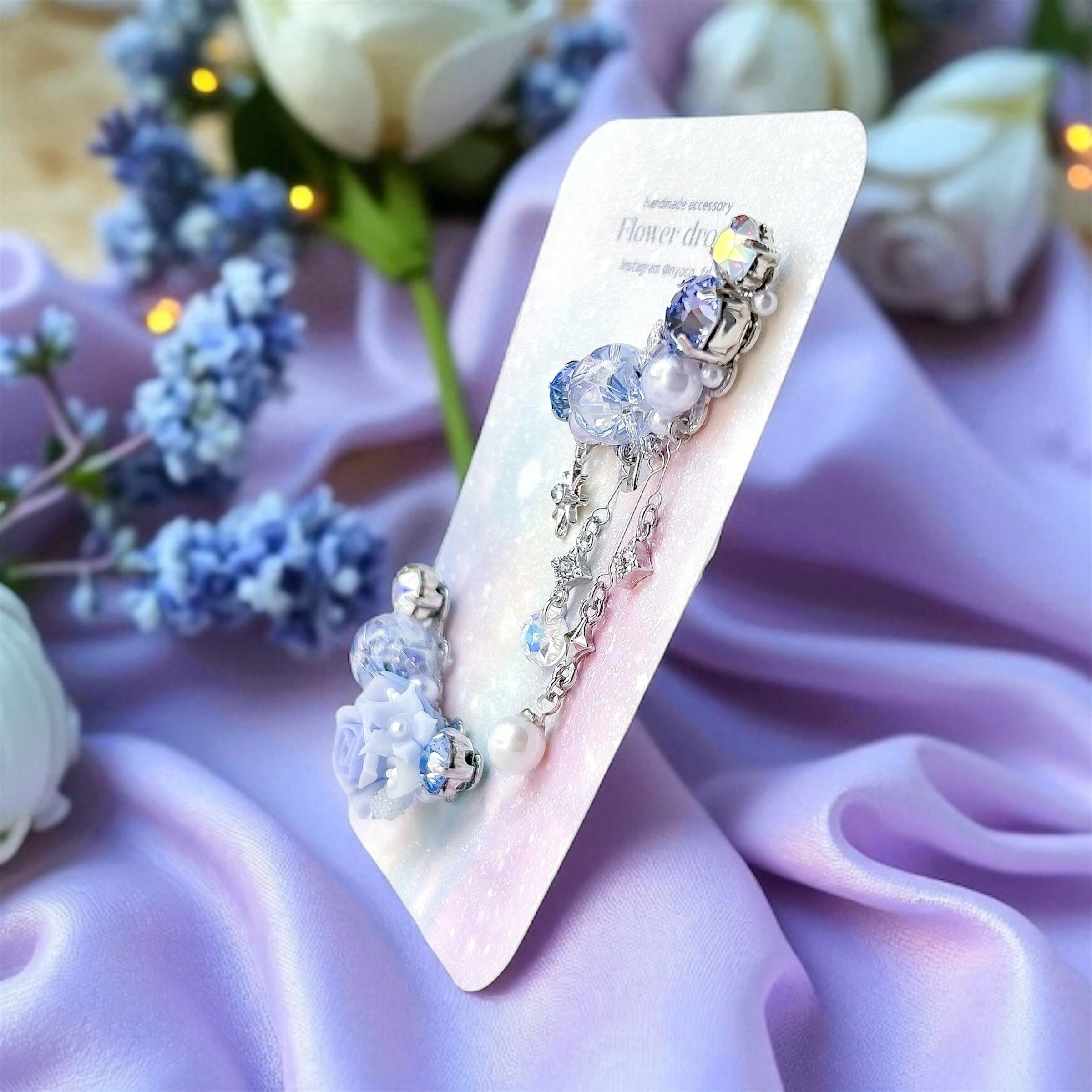 クリスタルドームビジュー♥クレイフラワーのイヤーカフ(ローズ/水色・青紫)