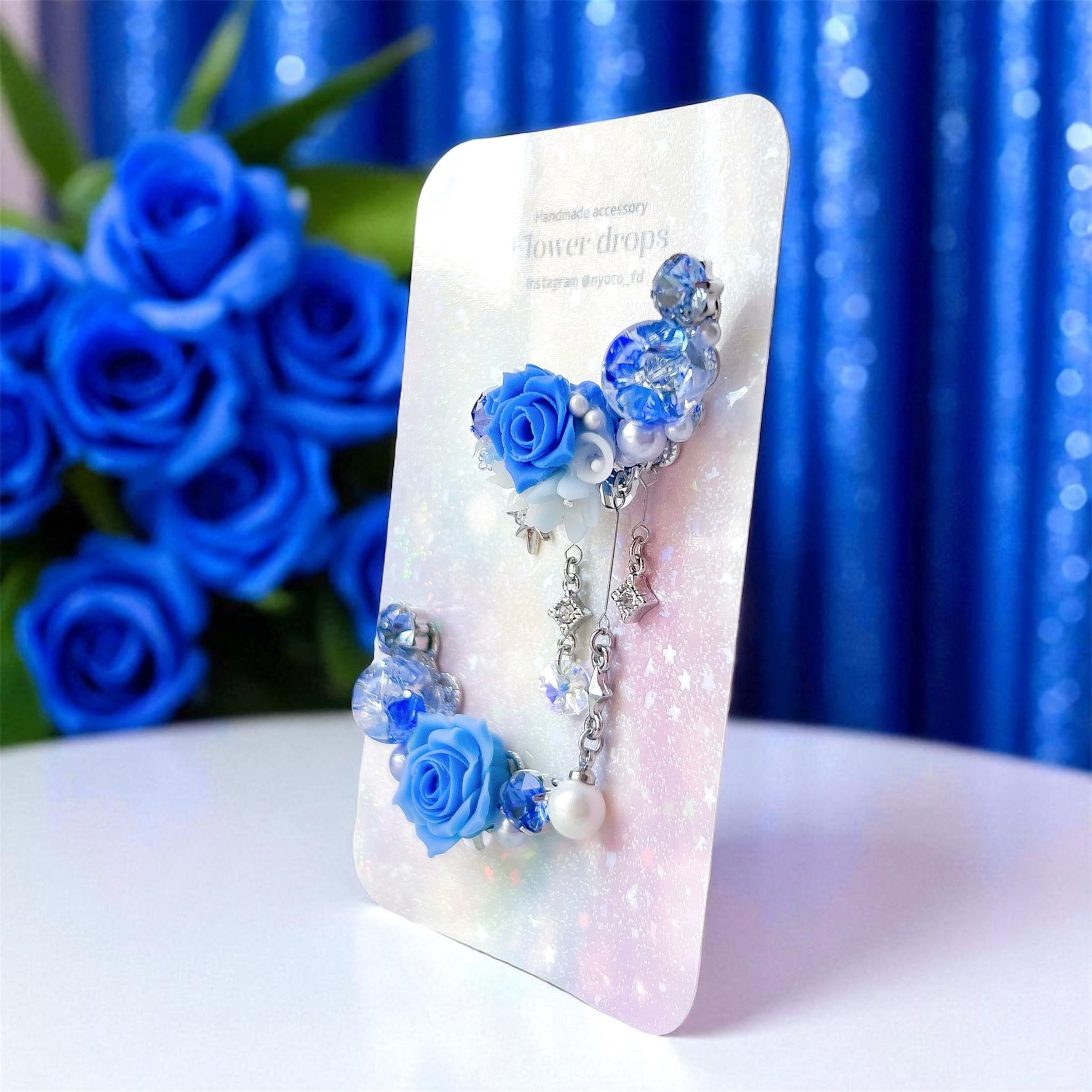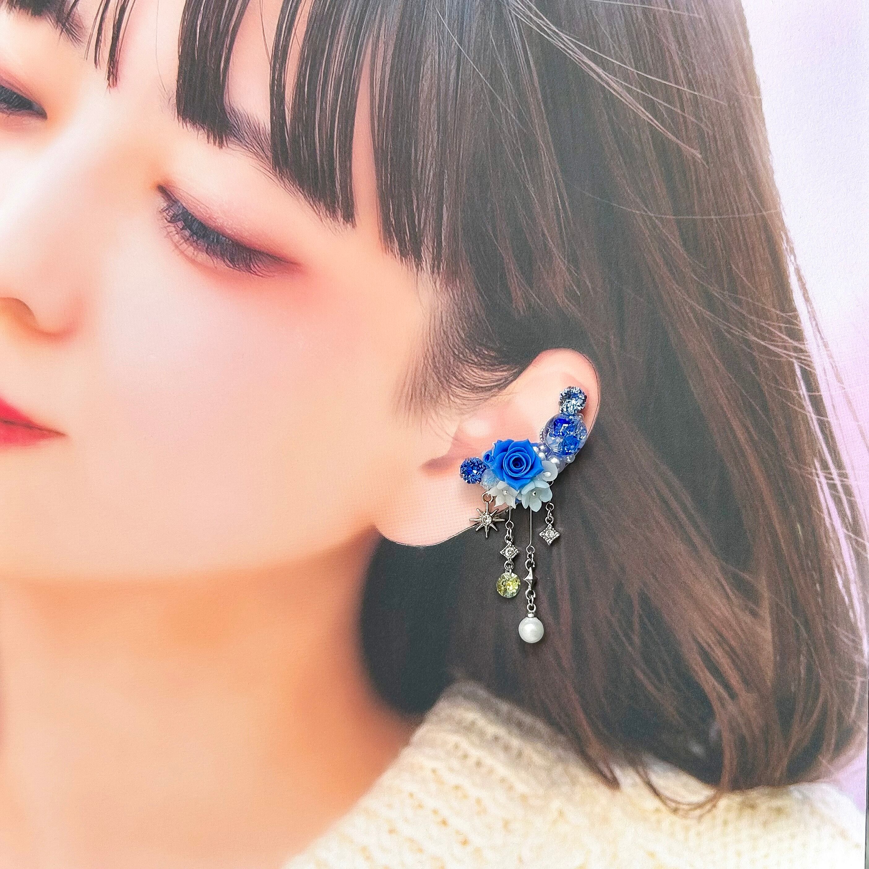 クリスタルドームビジュー♥クレイフラワーのイヤーカフ(ローズ/ブルー)