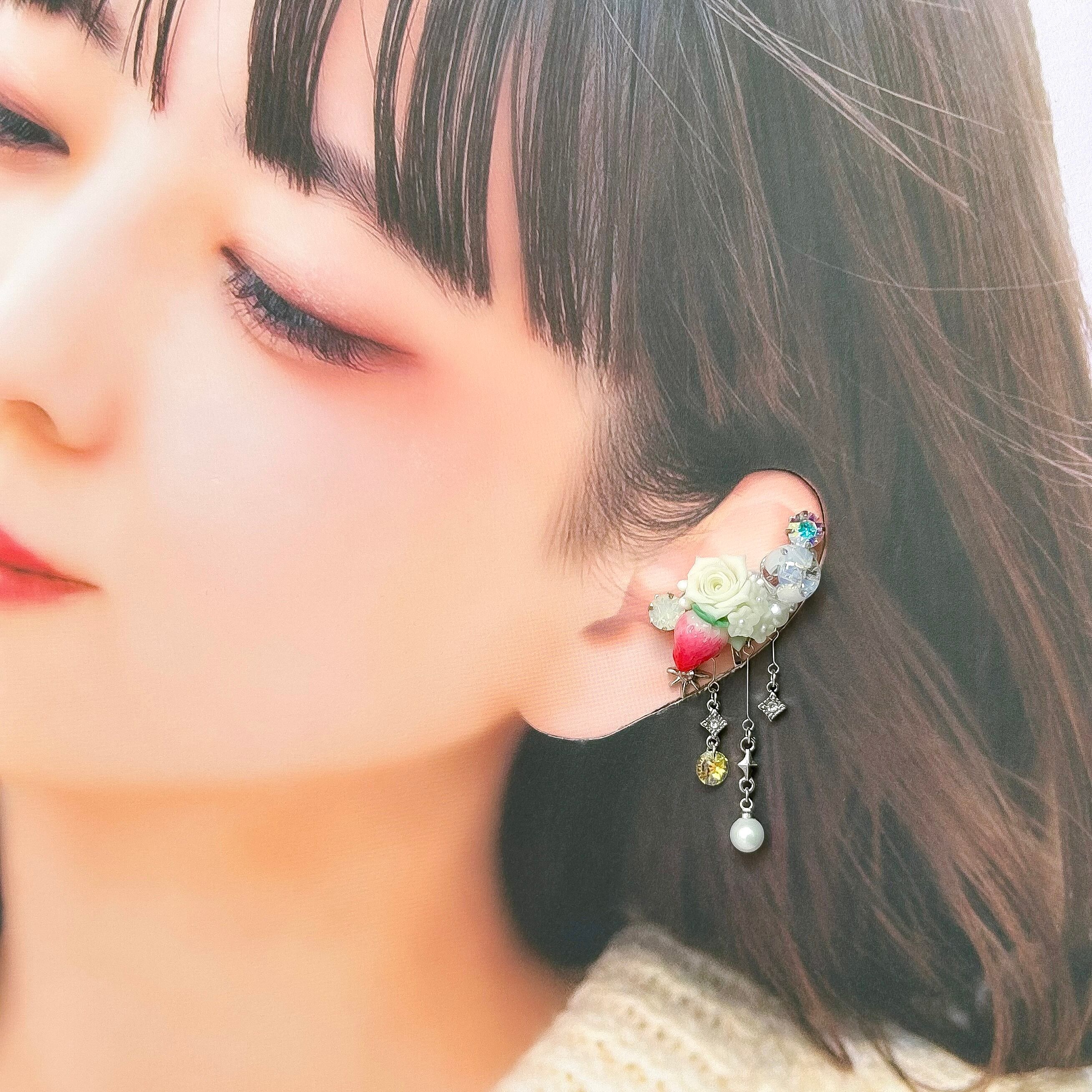 クリスタルドームビジュー♥クレイフラワーのイヤーカフ(ローズ/ホワイト)