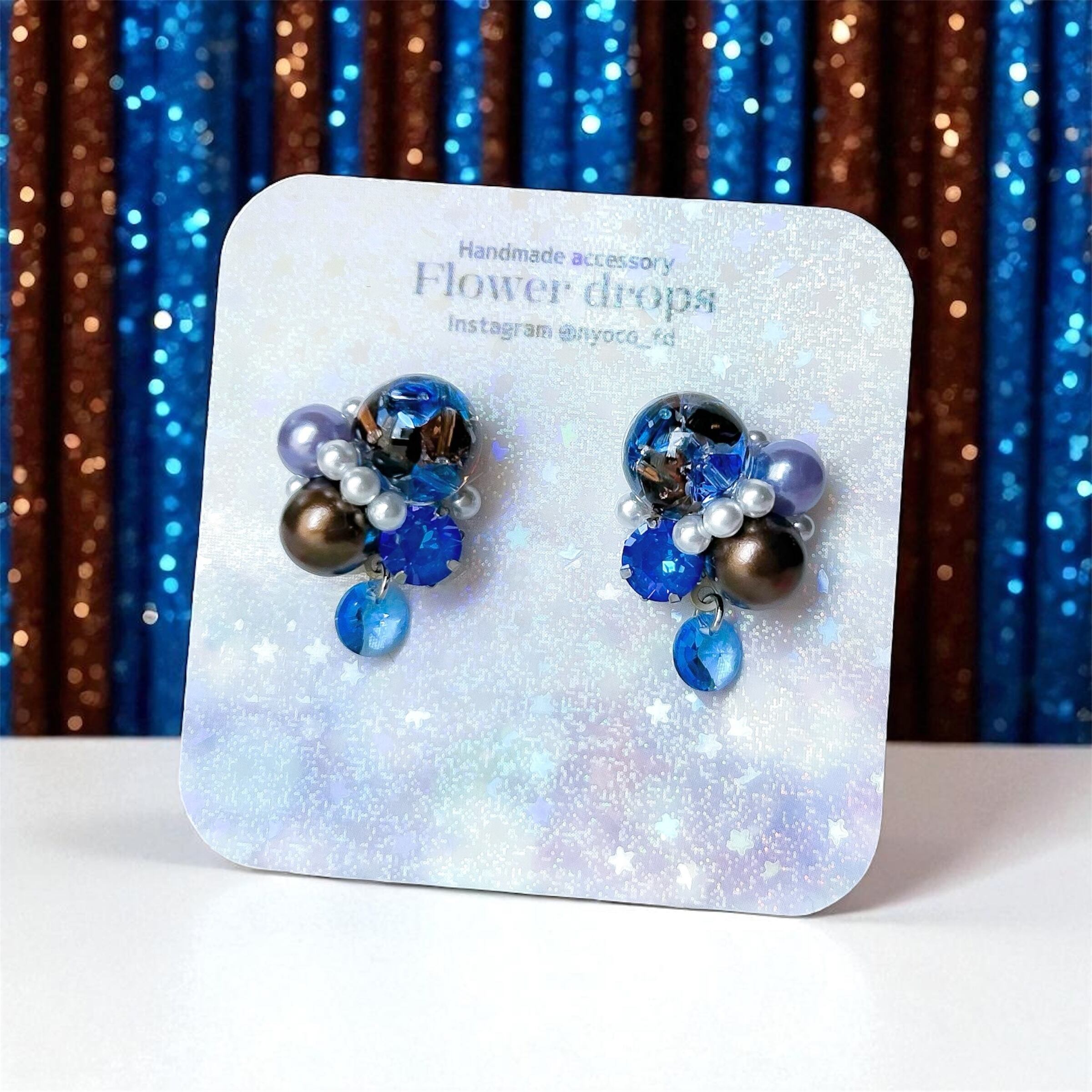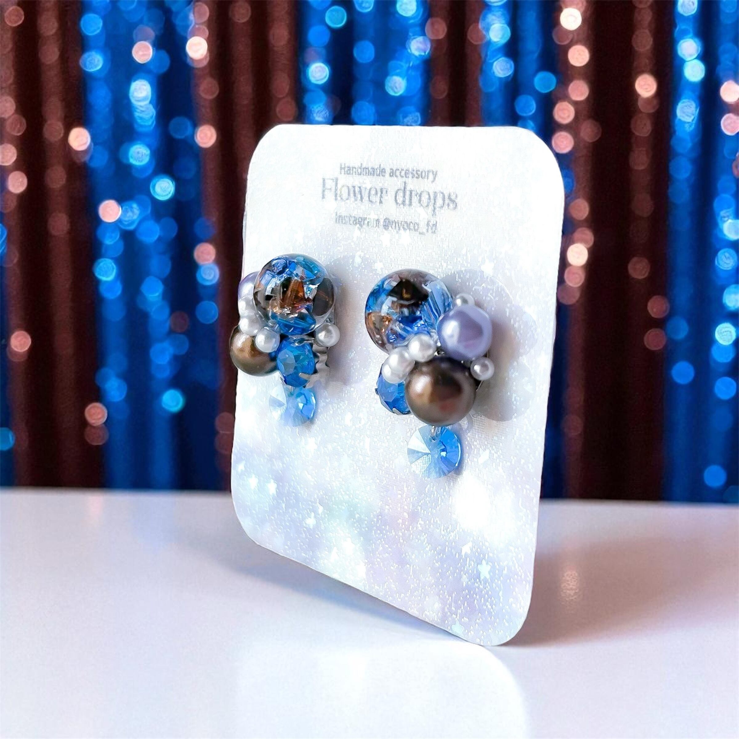 クリスタルドームビジューの耳飾り(ブルー・ブラウン)