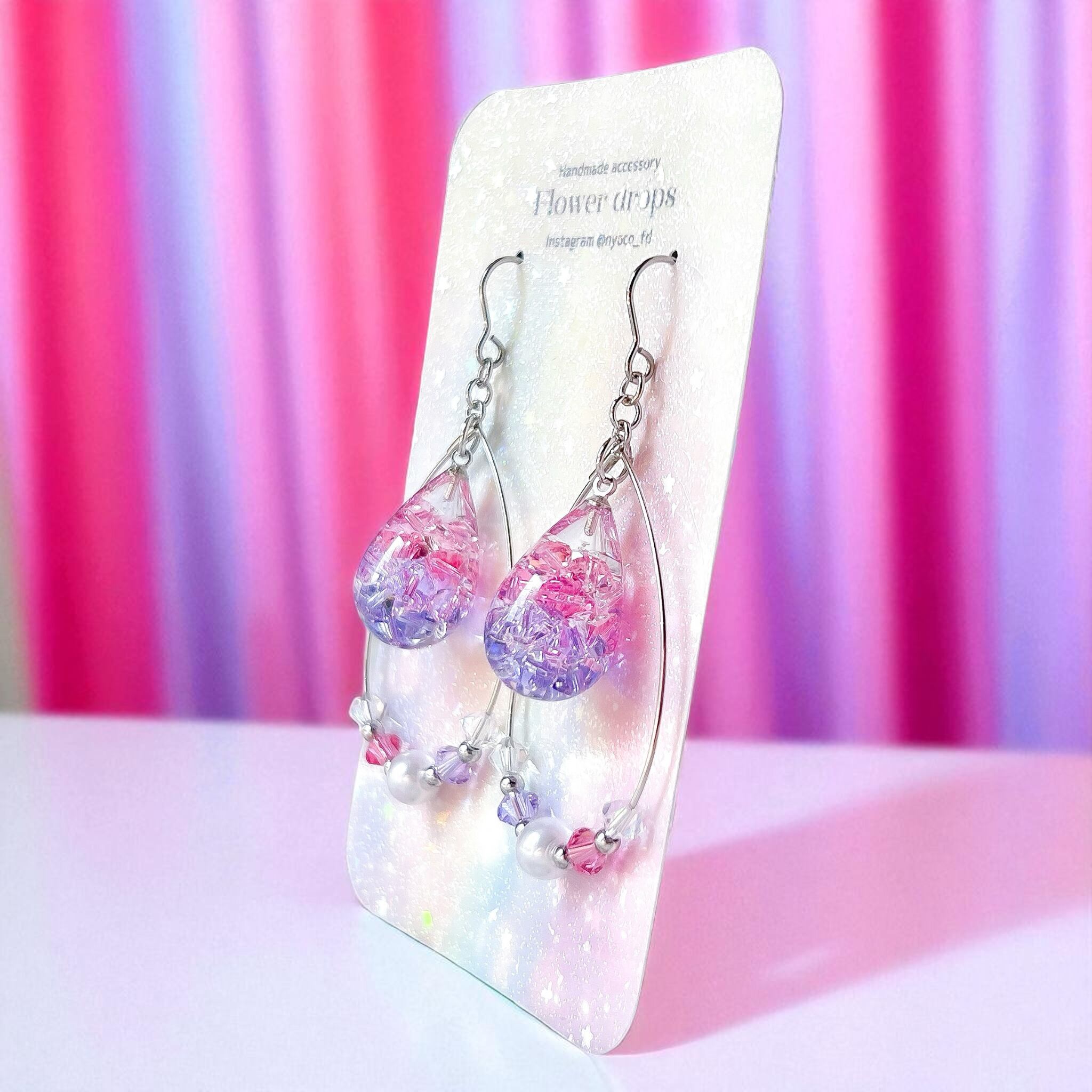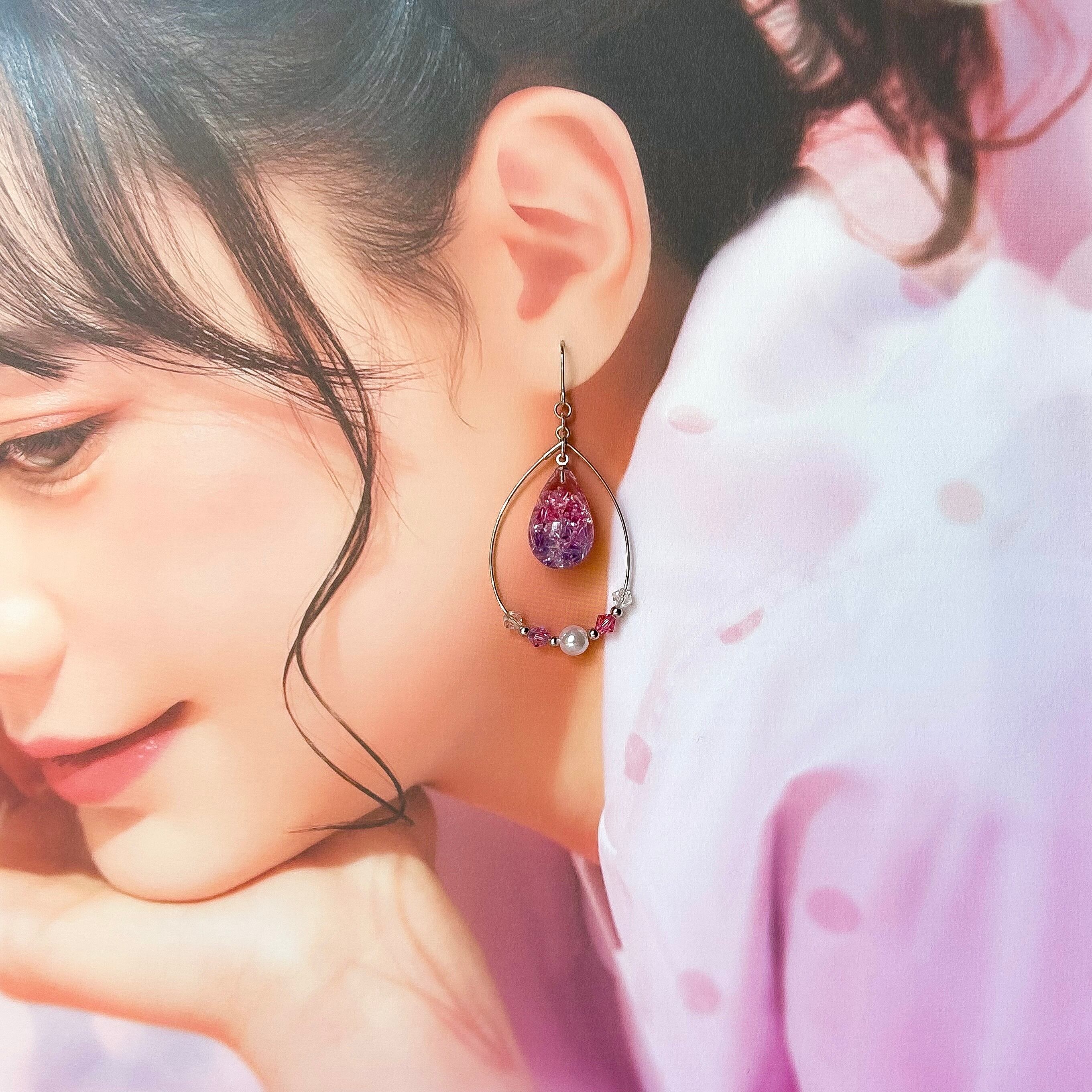 煌めくしずく♥しずくフープの耳飾り(ピンク・パープル)
