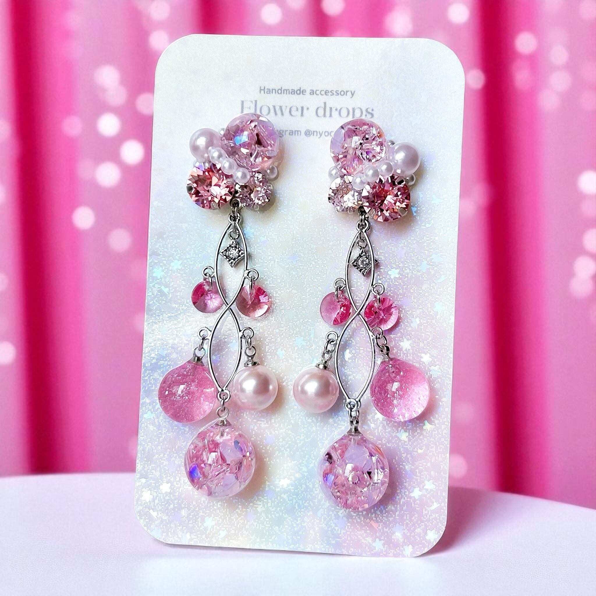 大粒のスワロフスキー・クリスタルやパールを贅沢にあしらい、華やかなビジューデザインに仕上げました。大きなドーム型レジンには、スワロフスキー・クリスタルビーズ、小さなドーム型レジンにはグリッターを閉じ込めて揺れるたびにきらめく特別な輝きを演出します。一つ一つ手作業で作られたオリジナルパーツが、唯一無二の美しさを生み出します。