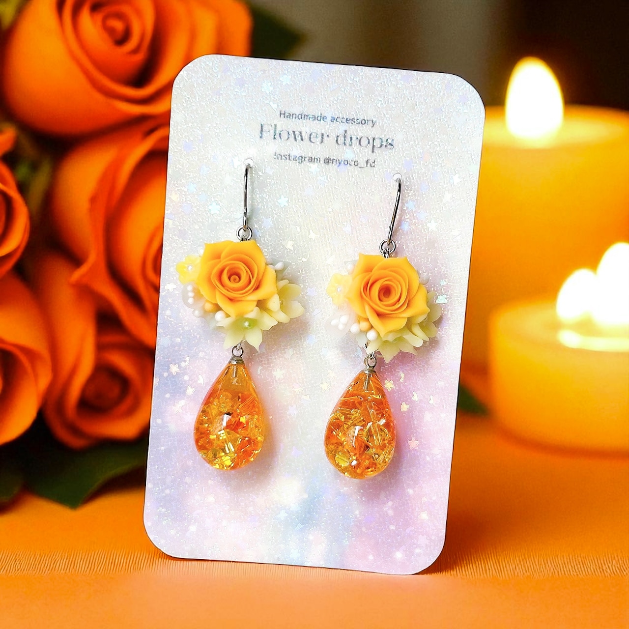 煌めくしずく♥クレイフラワーの耳飾り(ローズ/オレンジ)