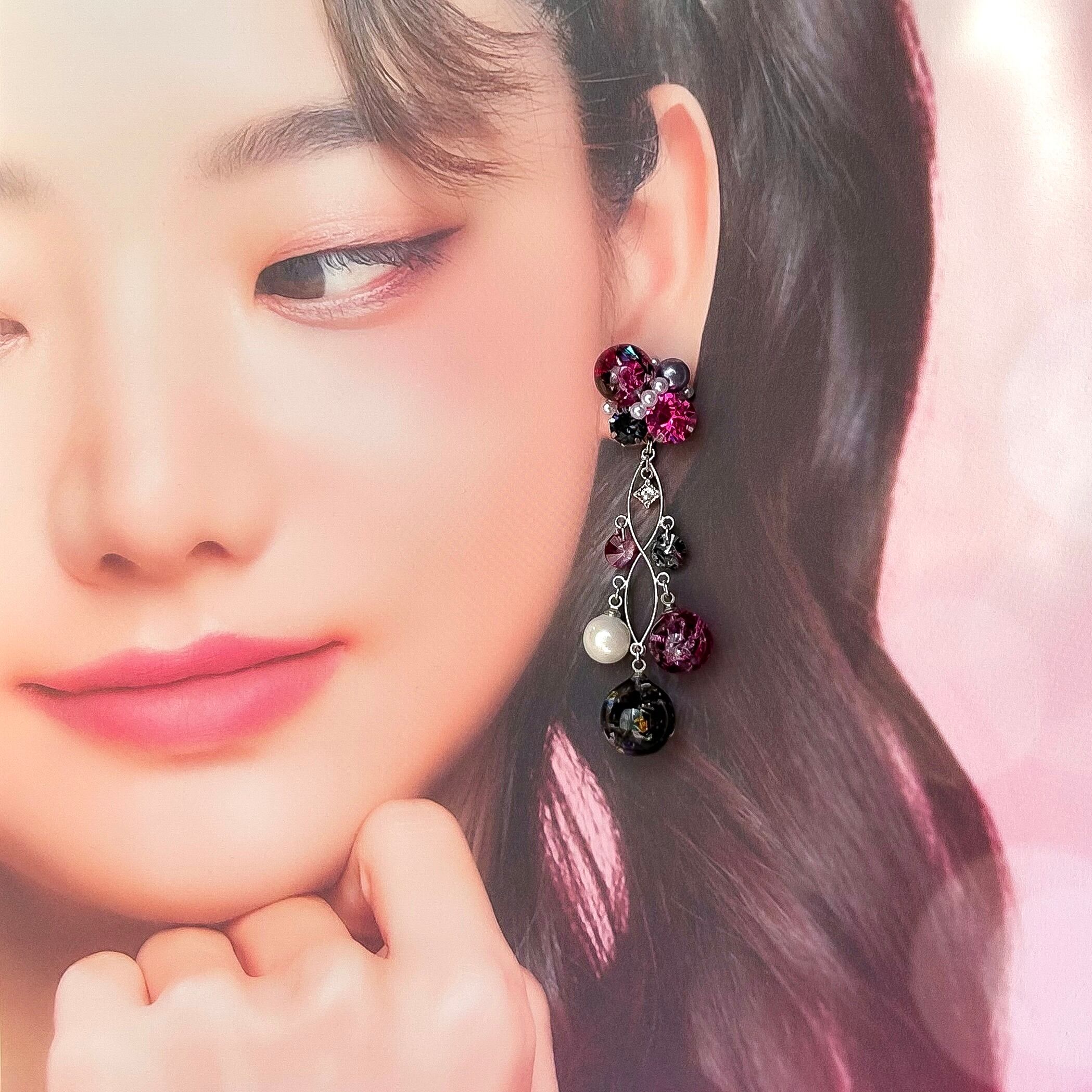 クリスタルドームビジュー♥シャンデリアの耳飾り(ブラック・マゼンタ)