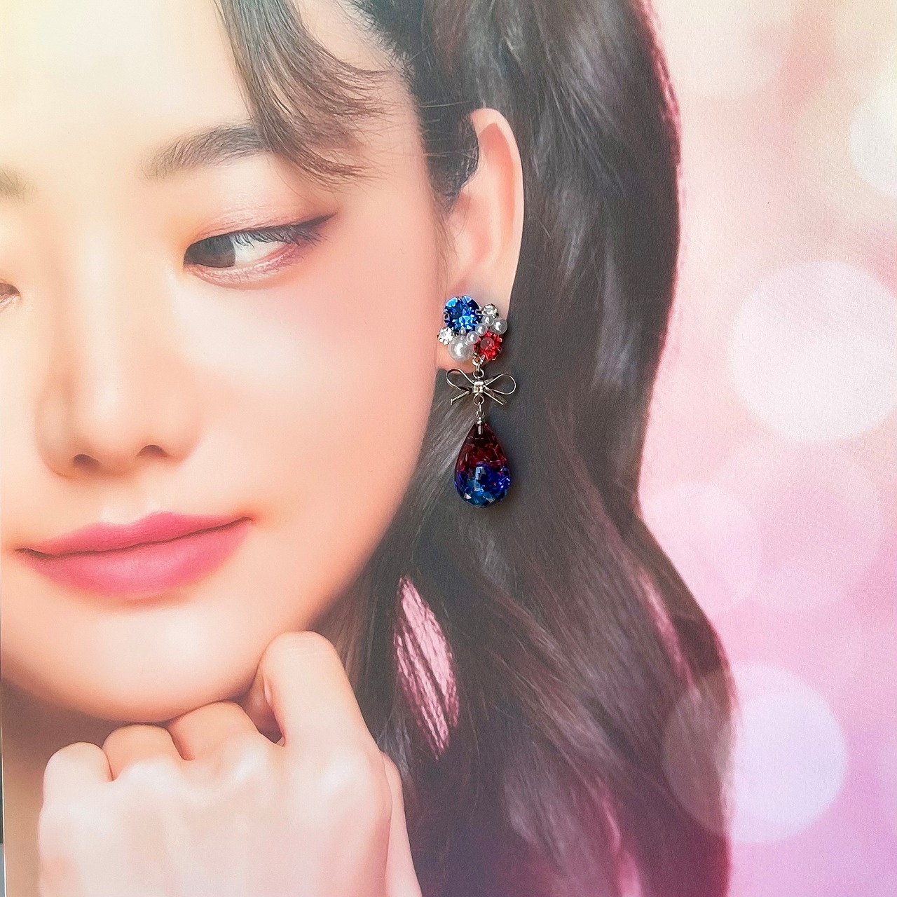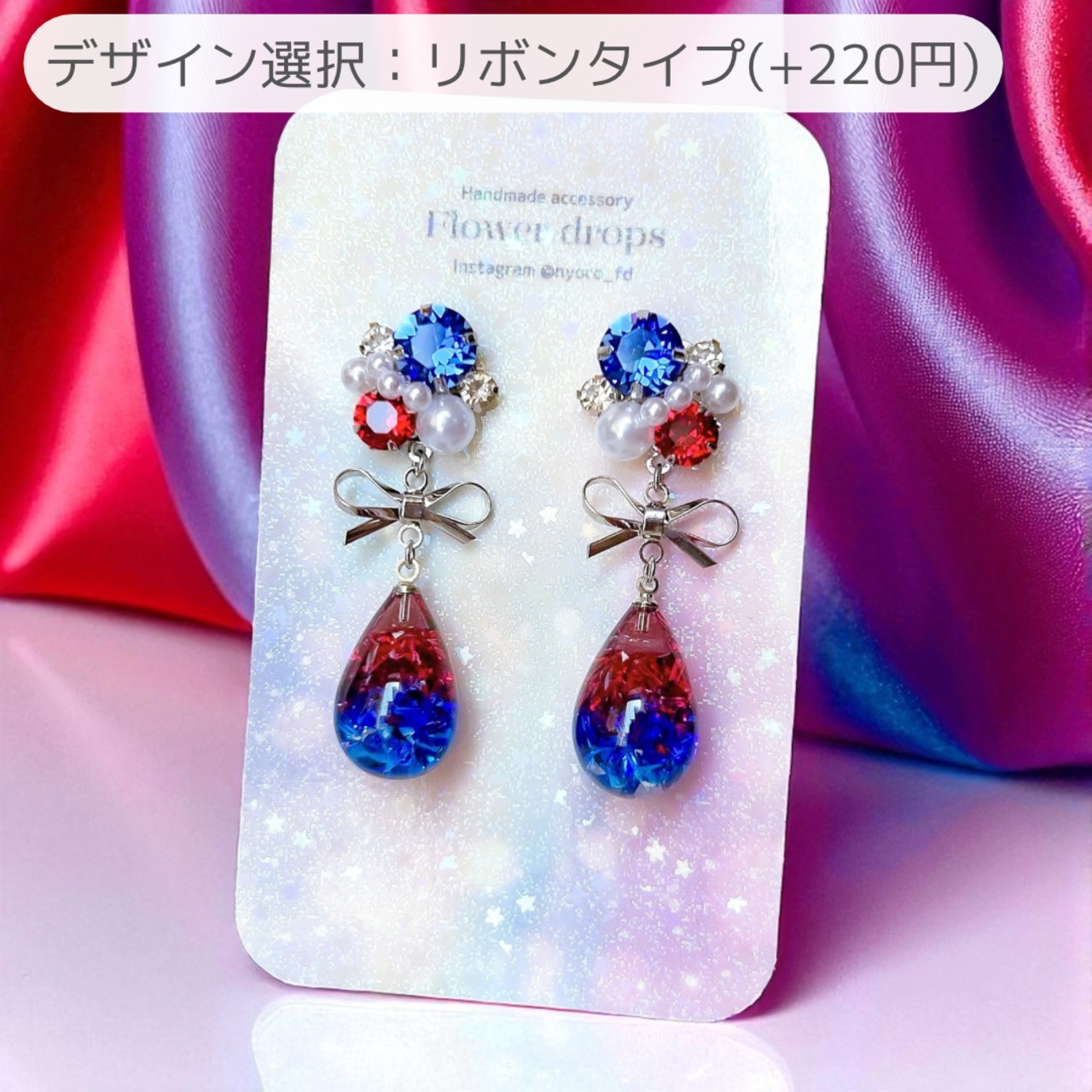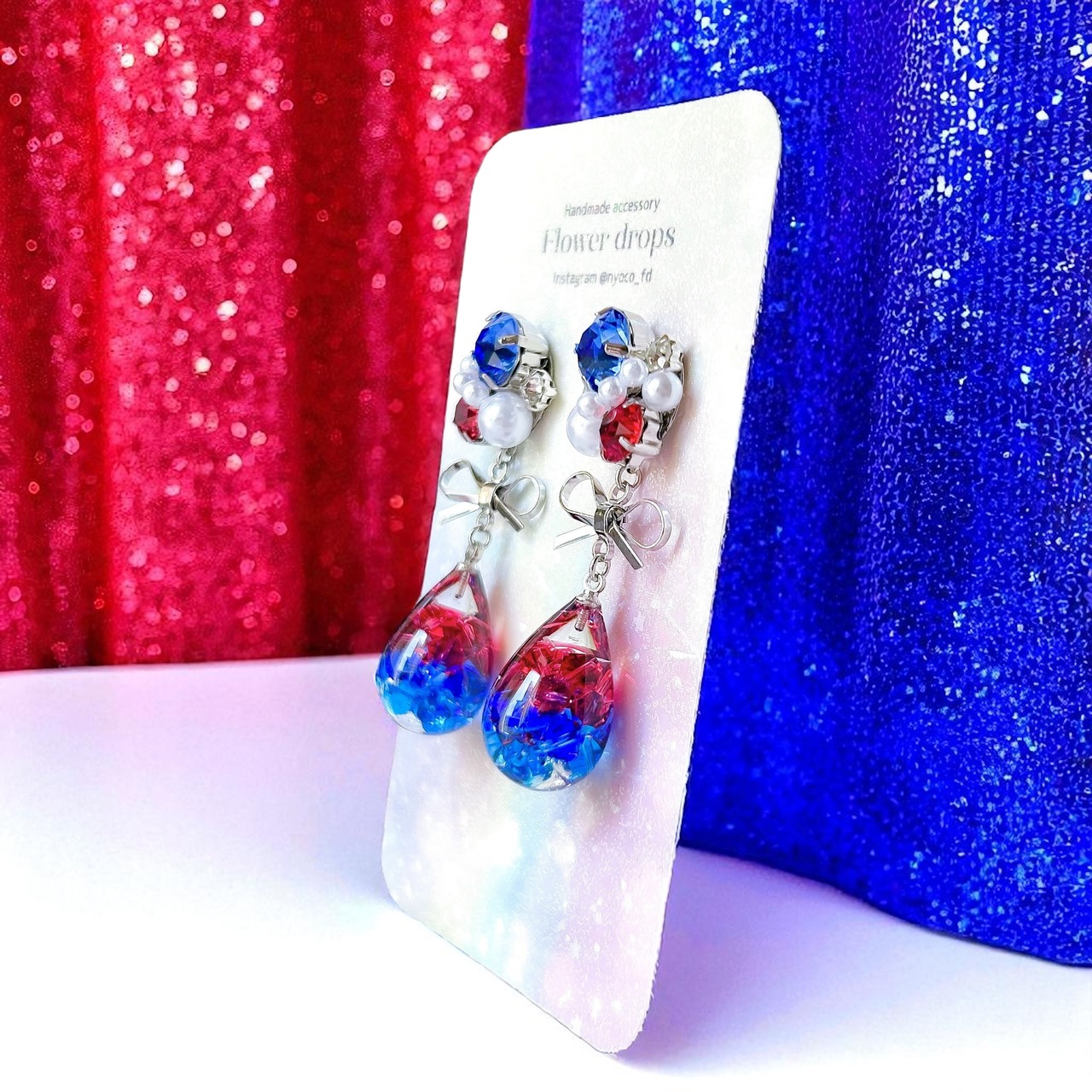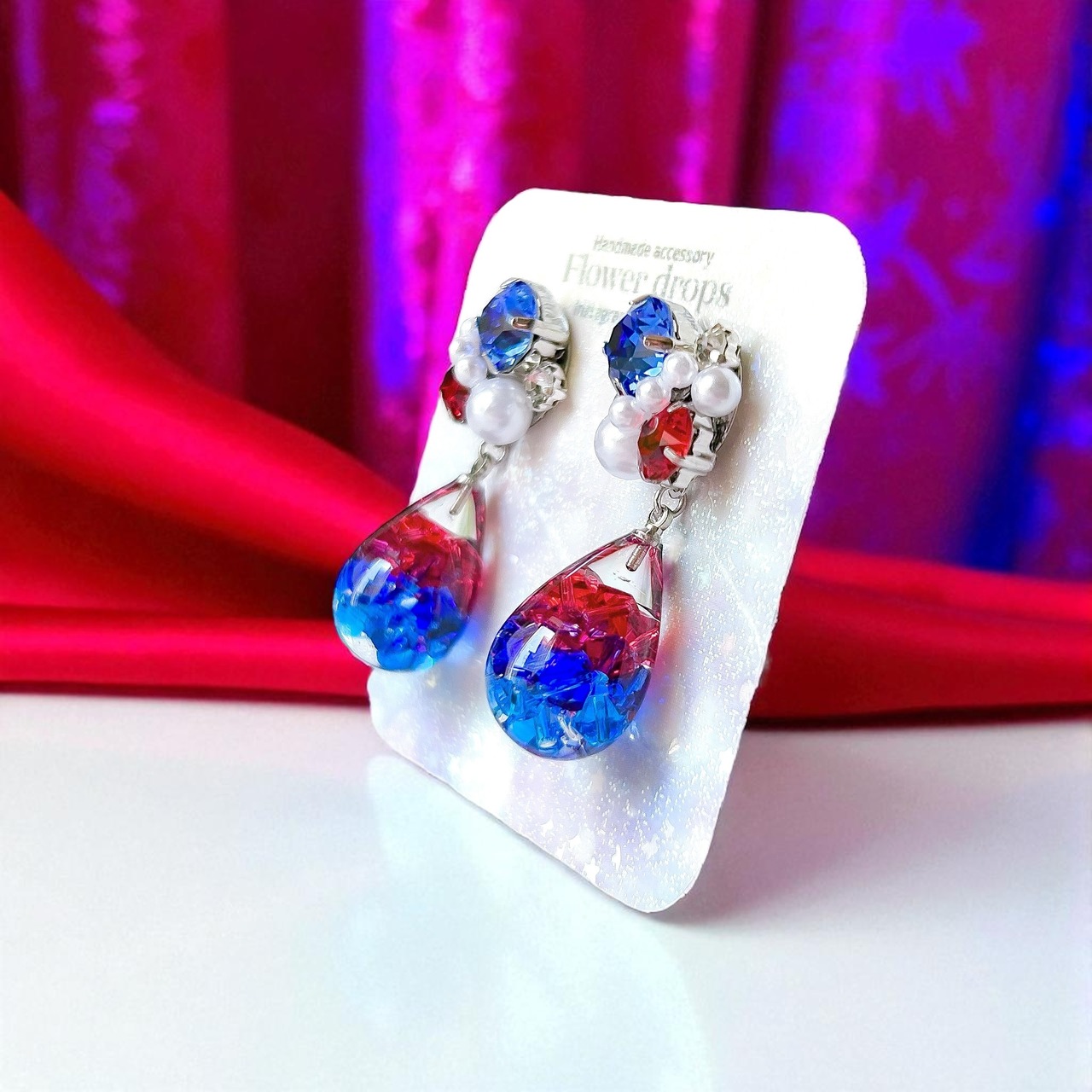 煌めくしずく♥ビジューの耳飾り(レッド・ブルー)