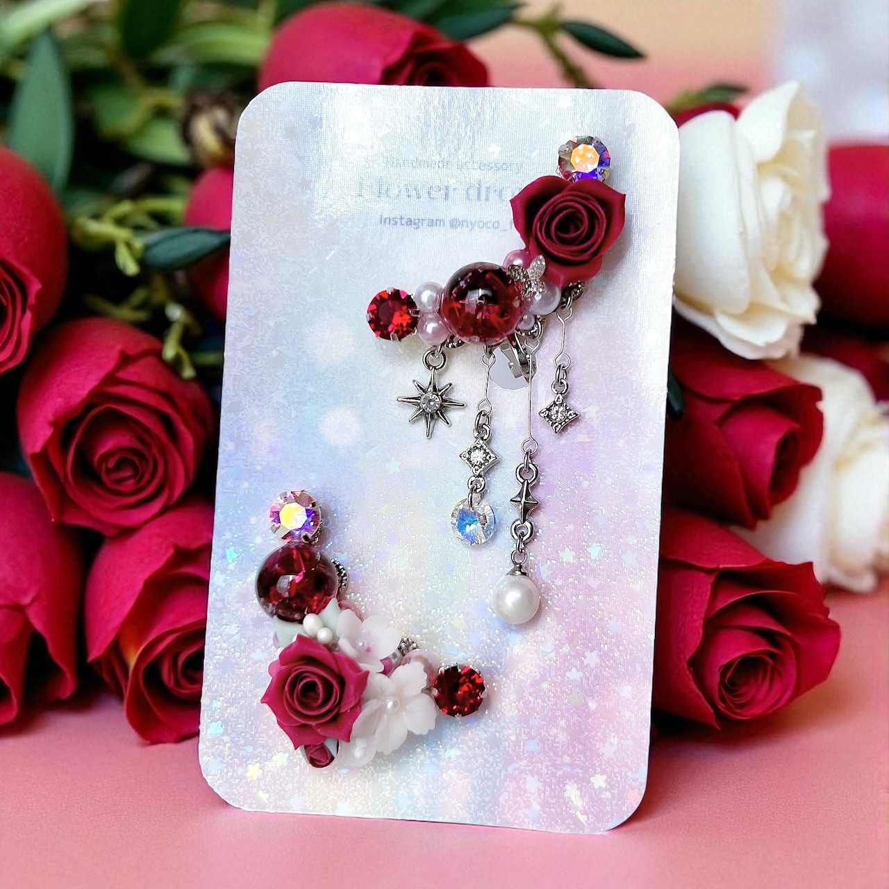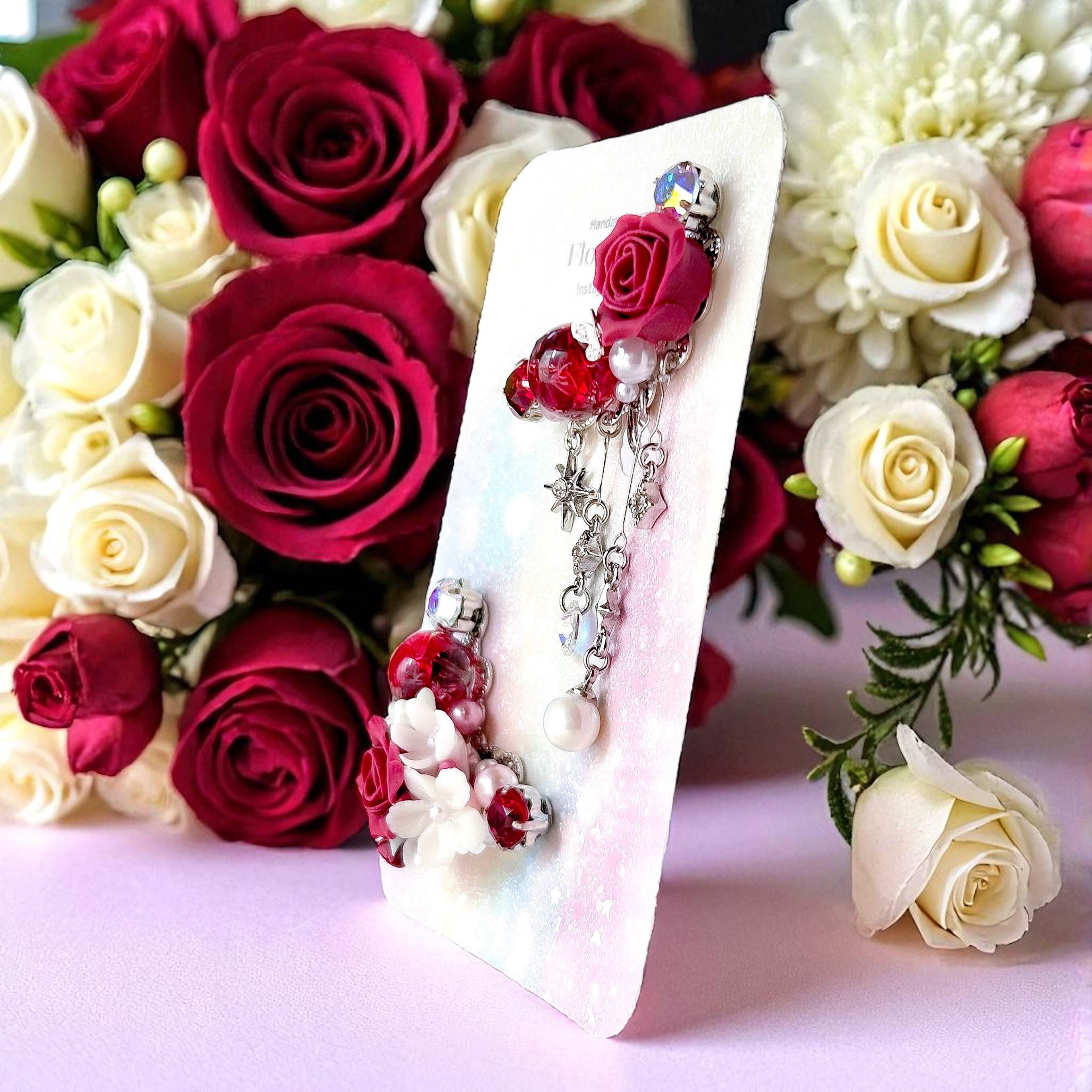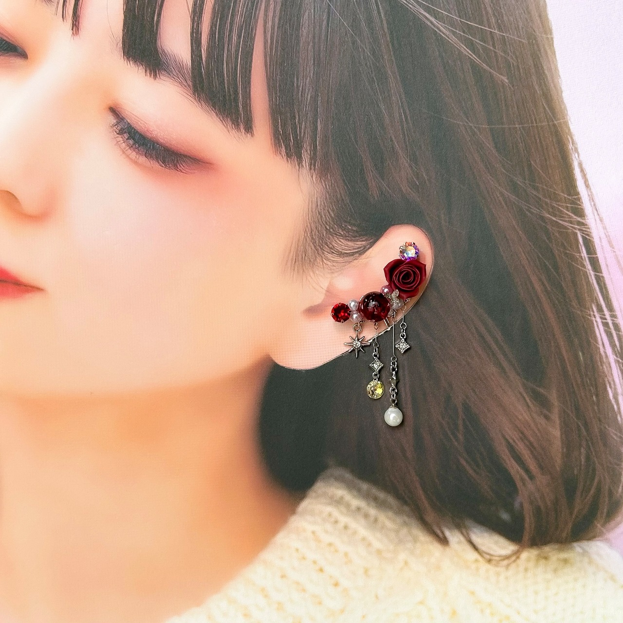 クリスタルドームビジュー♥クレイフラワーのイヤーカフ(ローズ/ボルドー)
