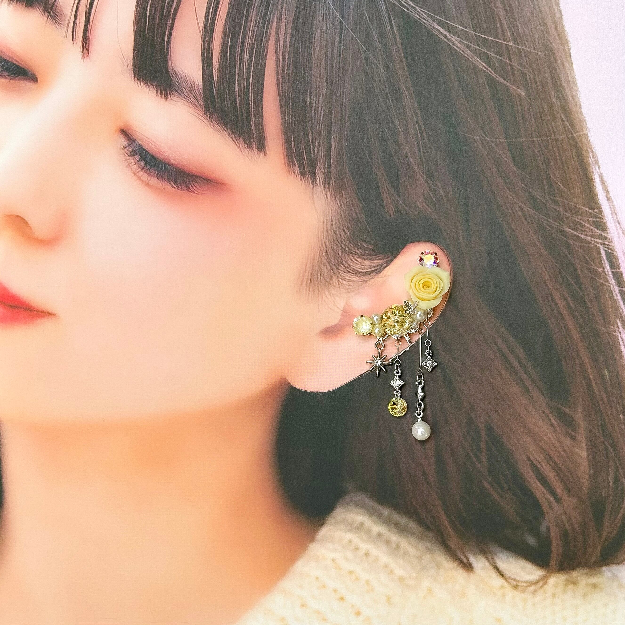 クリスタルドームビジュー♥クレイフラワーのイヤーカフ(ローズ/イエロー)