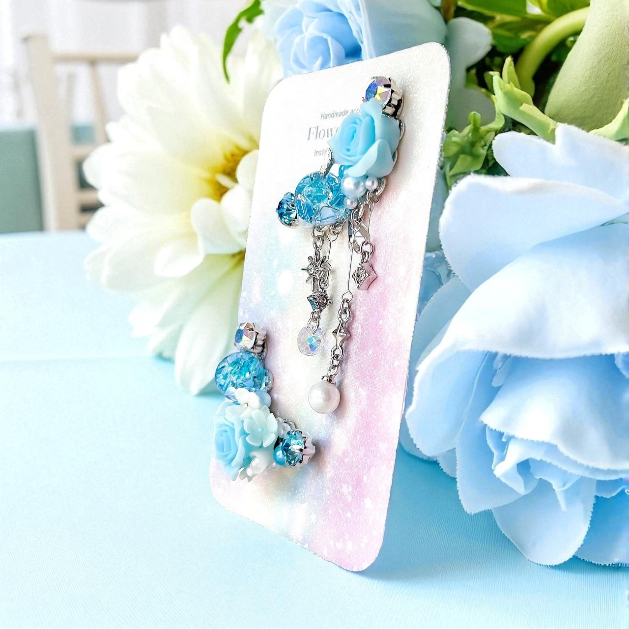 クリスタルドームビジュー♥クレイフラワーのイヤーカフ(ローズ/水色)