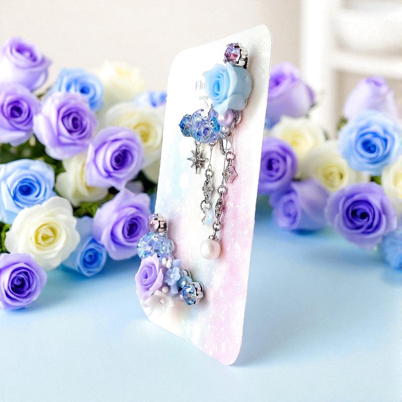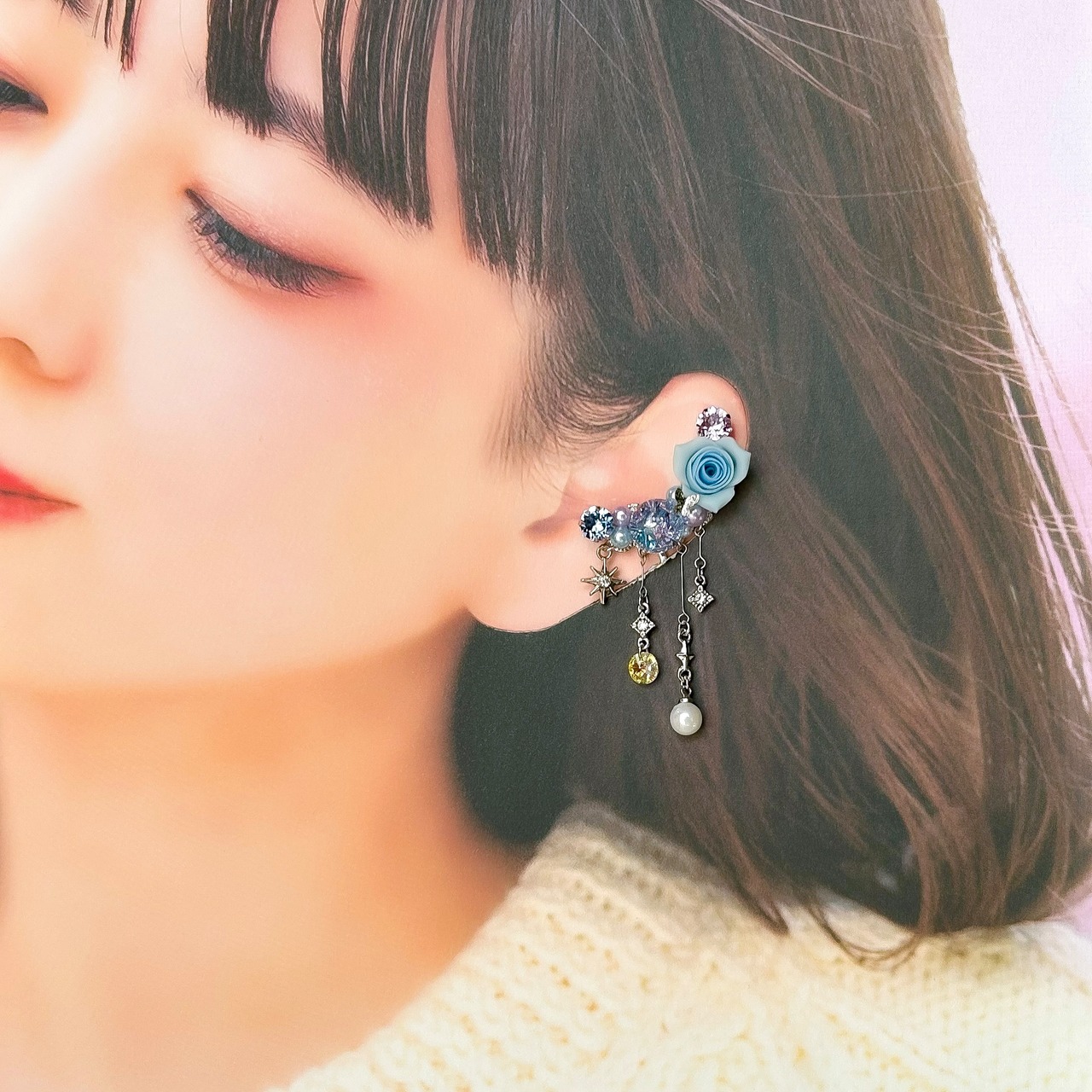 クリスタルドームビジュー♥クレイフラワーのイヤーカフ(ローズ/水色・パープル)