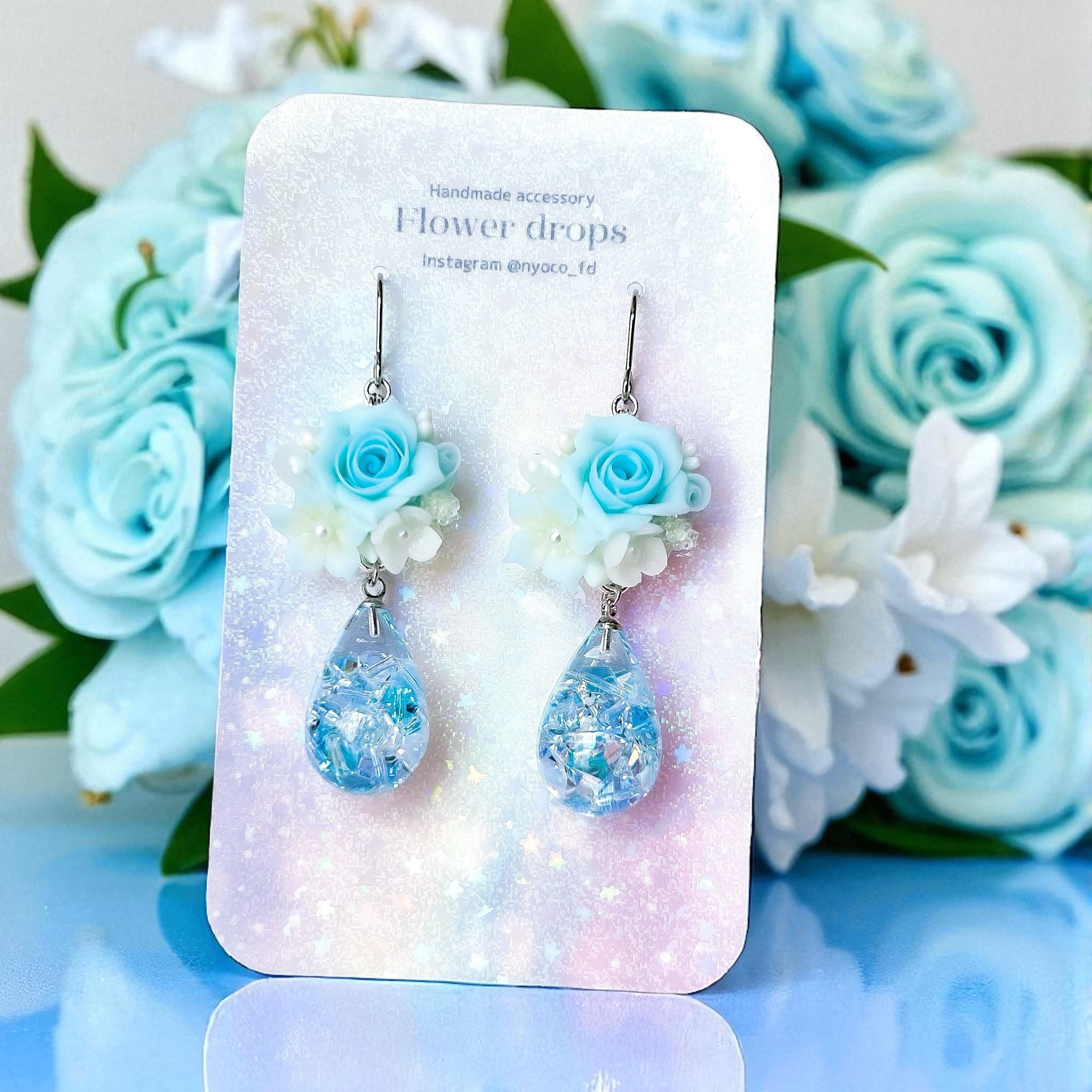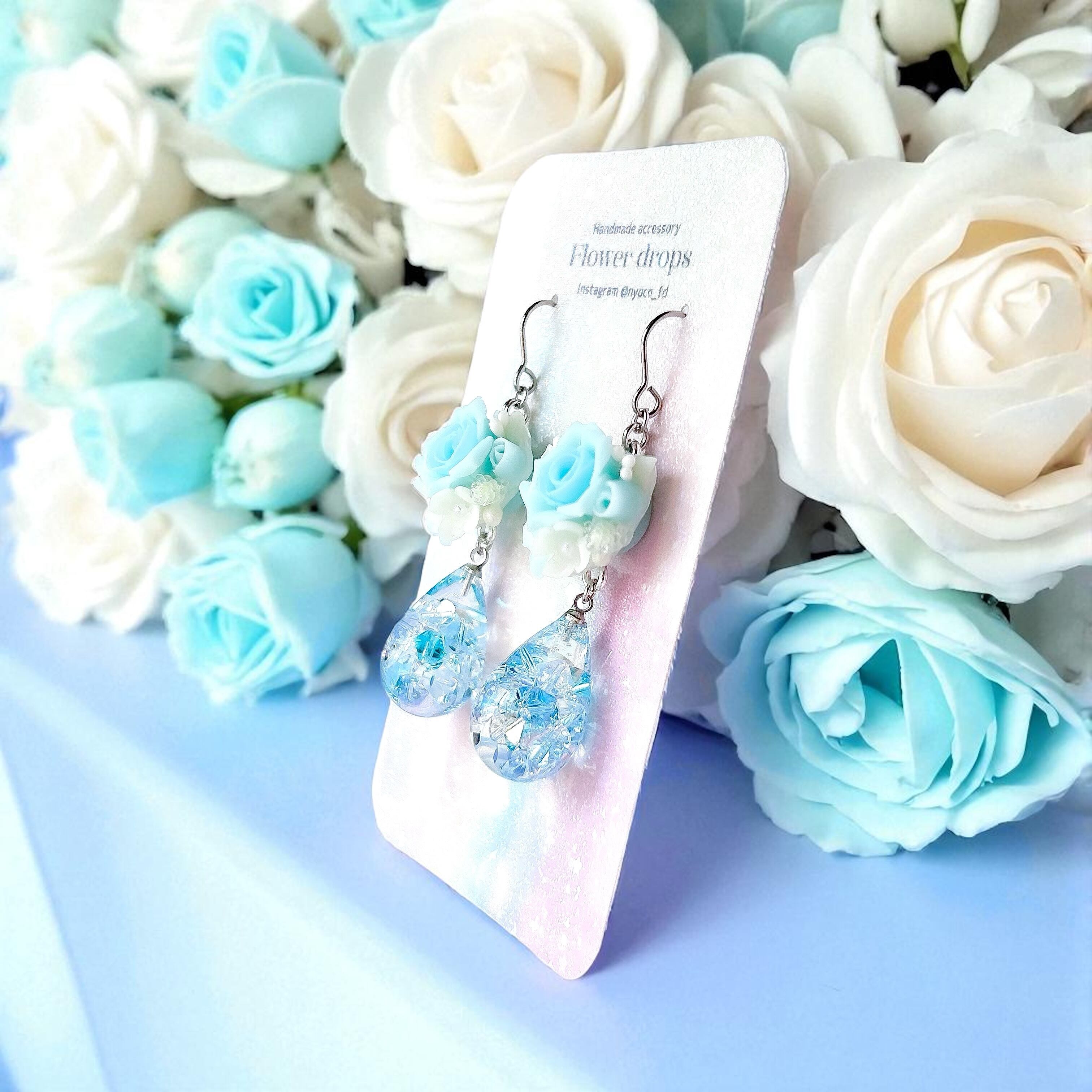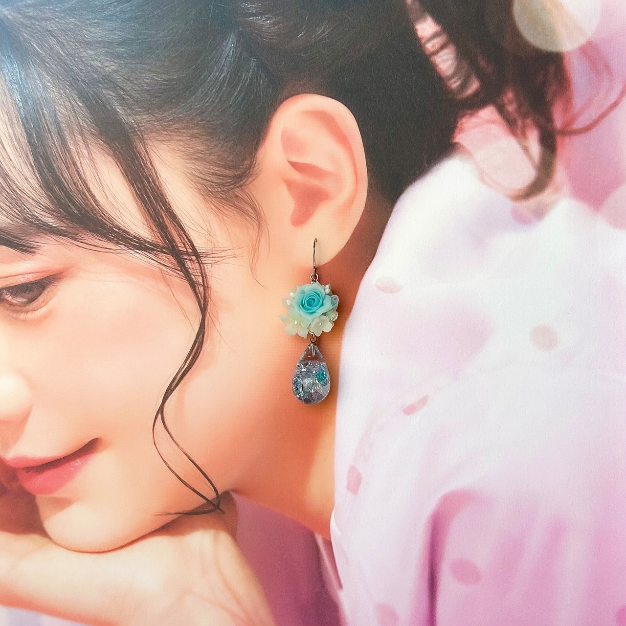 煌めくしずく♥クレイフラワーの耳飾り(ローズ/水色)