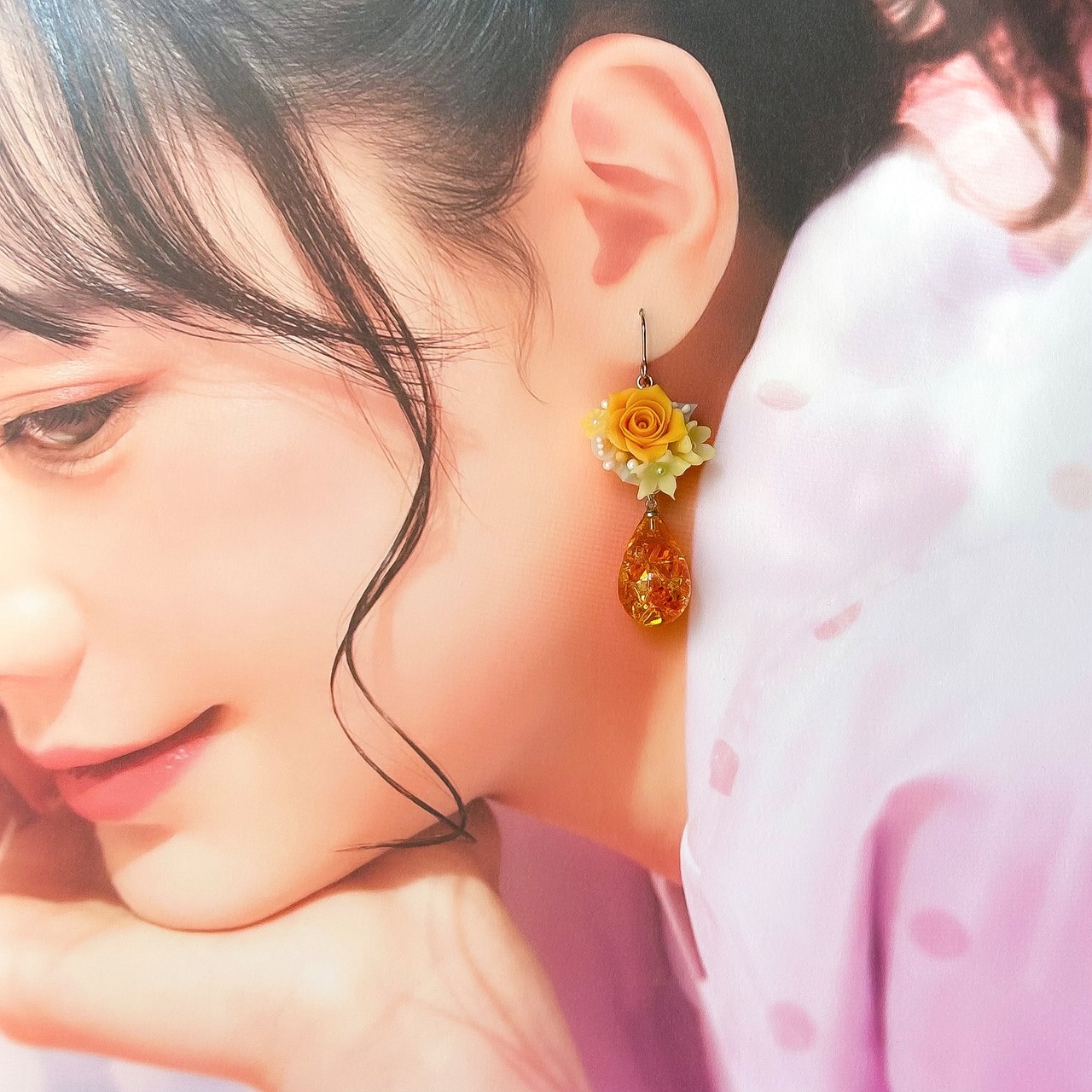 煌めくしずく♥クレイフラワーの耳飾り(ローズ/オレンジ)