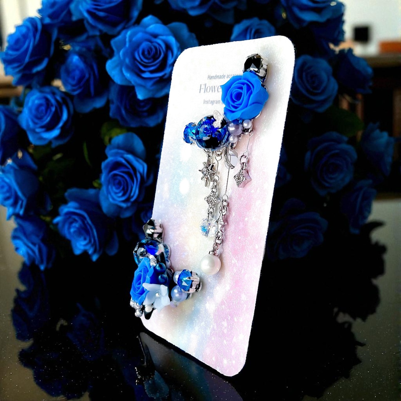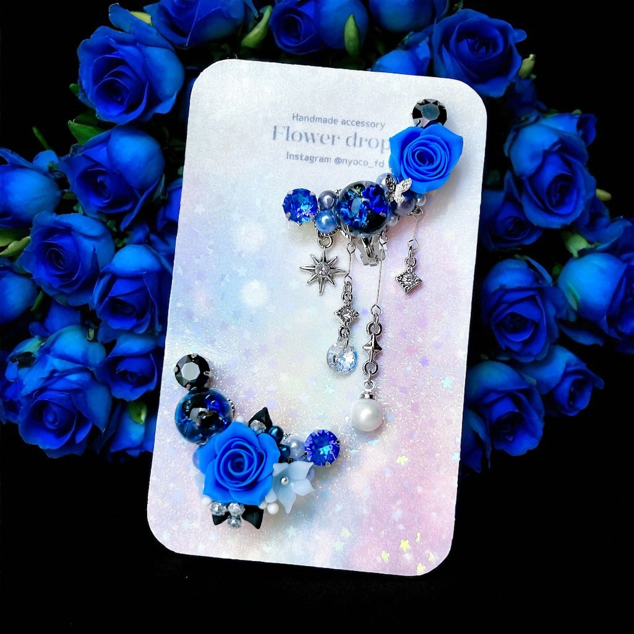 クリスタルドームビジュー♥クレイフラワーのイヤーカフ(ローズ/ブルー・ブラック)
