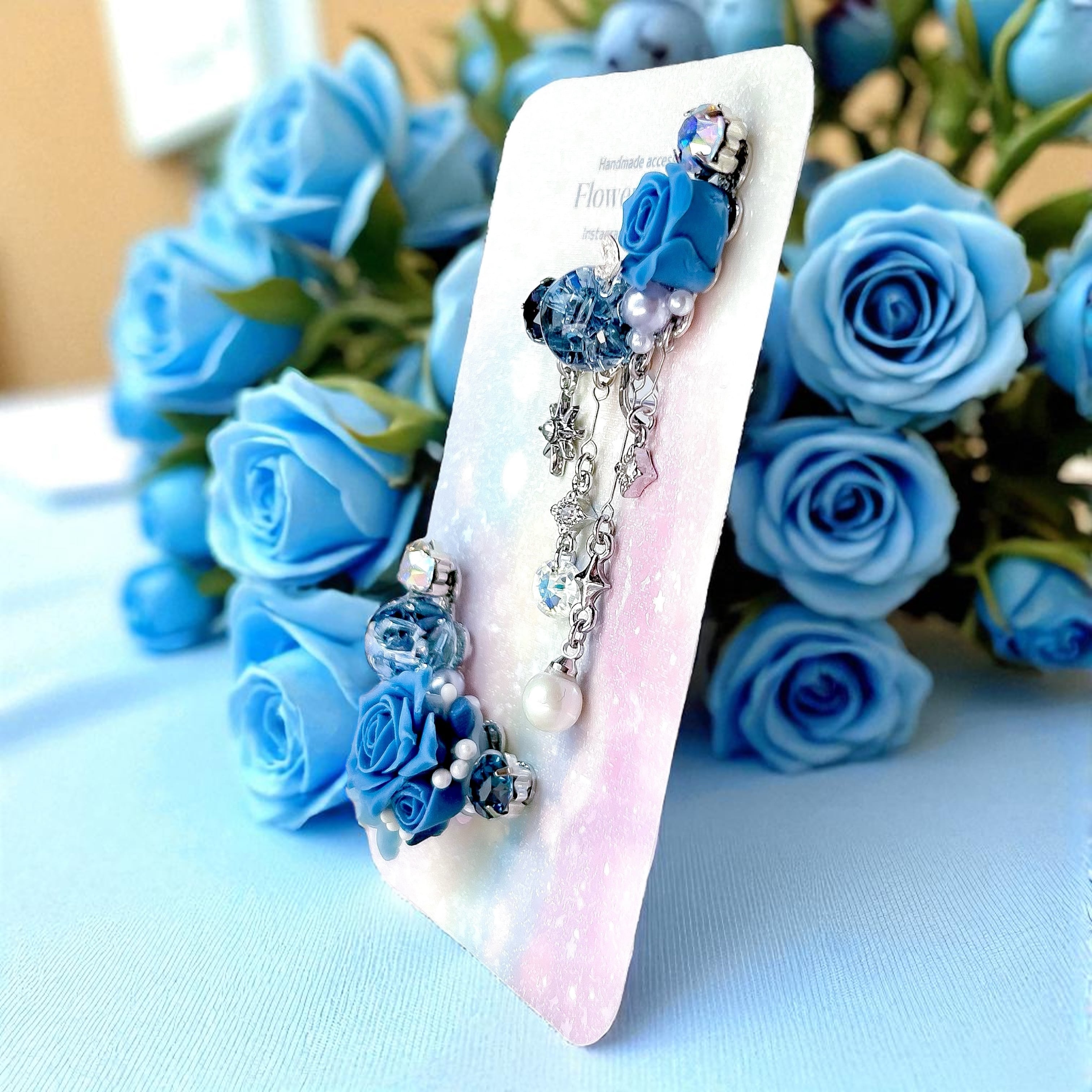 クリスタルドームビジュー♥クレイフラワーのイヤーカフ(ローズ/デニムブルー)