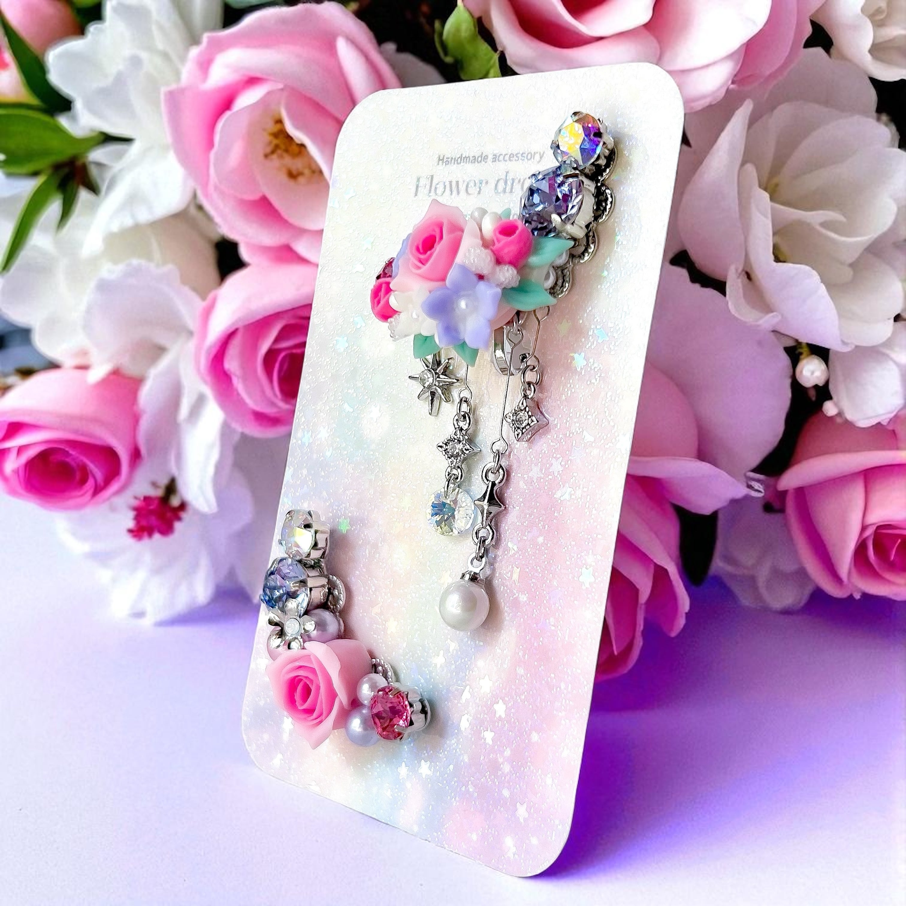 華やかなビジューデザインが魅力のハンドメイドイヤーカフ2点セットです。樹脂粘土パーツやスワロフスキー・クリスタルのダイヤカットストーン、パールを贅沢に組み合わせ、耳元をエレガントに彩ります。