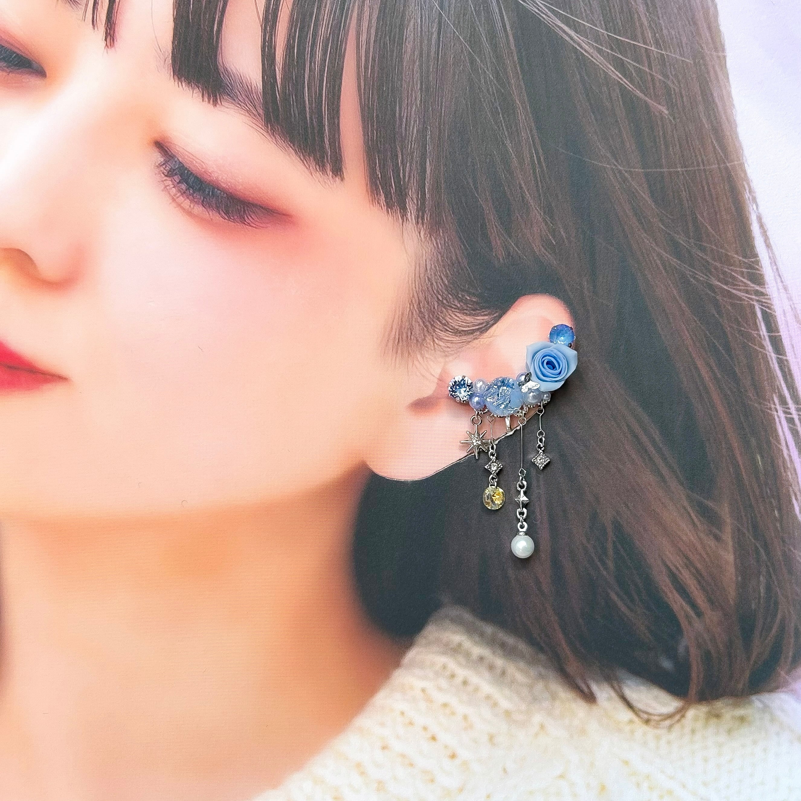 クリスタルドームビジュー♥クレイフラワーのイヤーカフ(ローズ/パステルブルー)