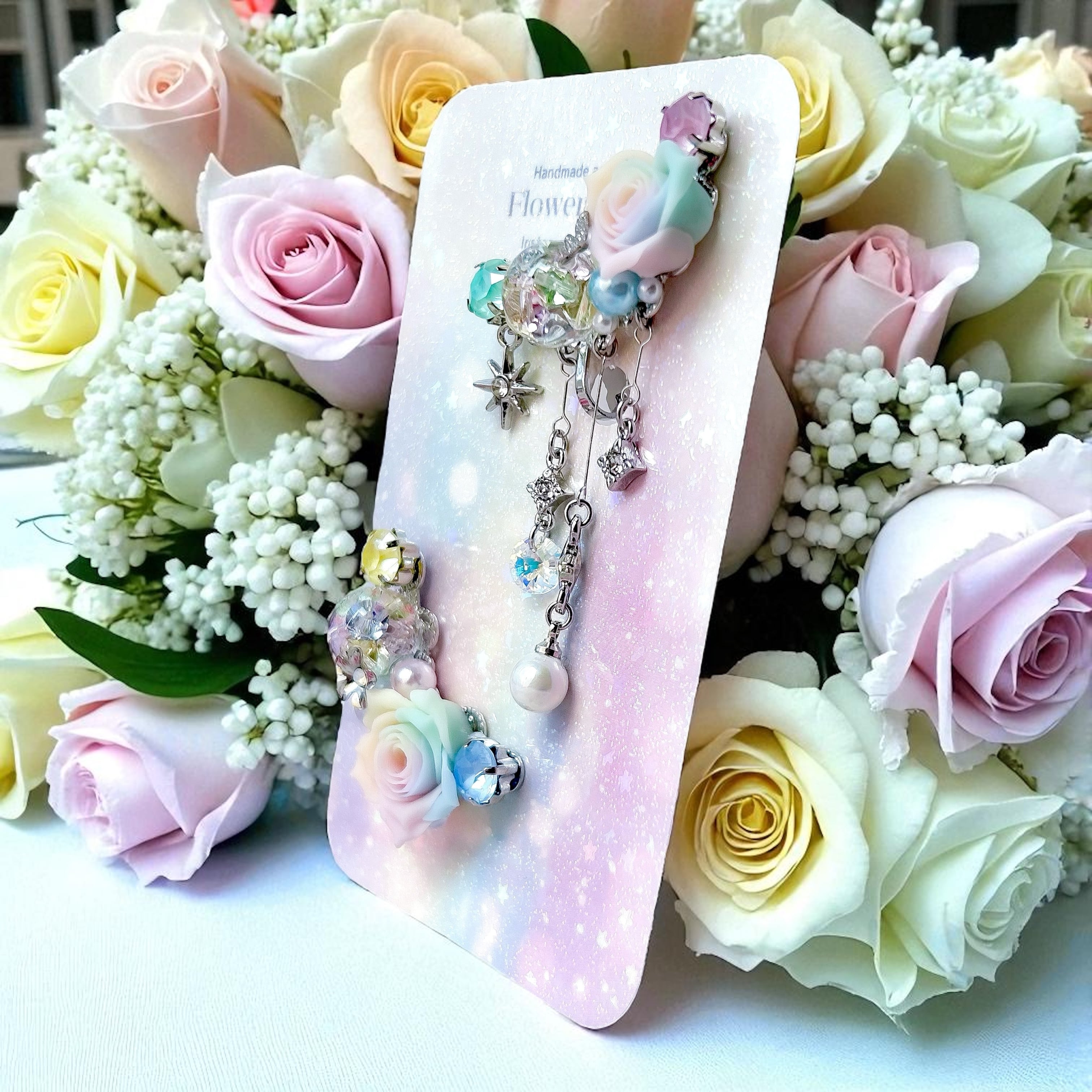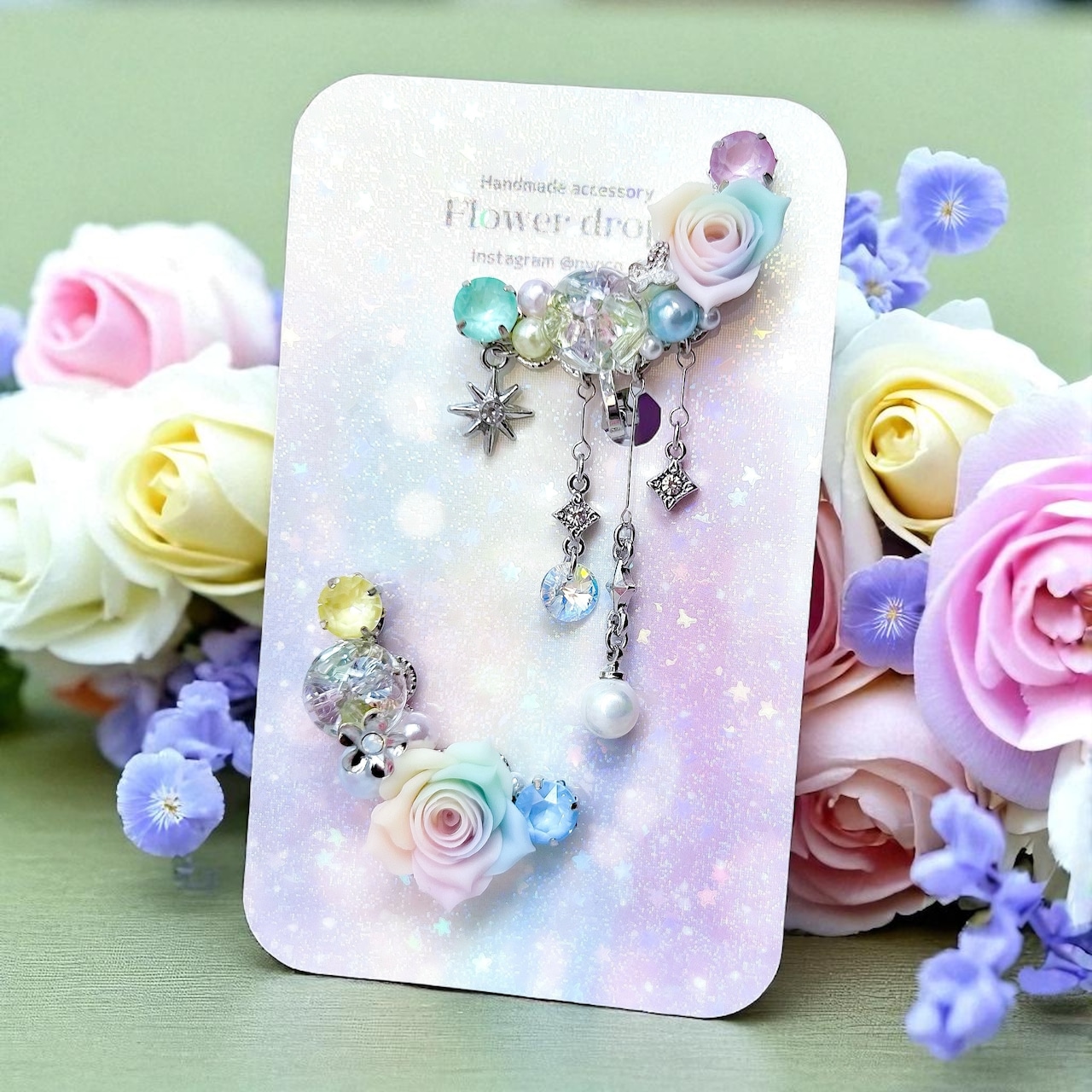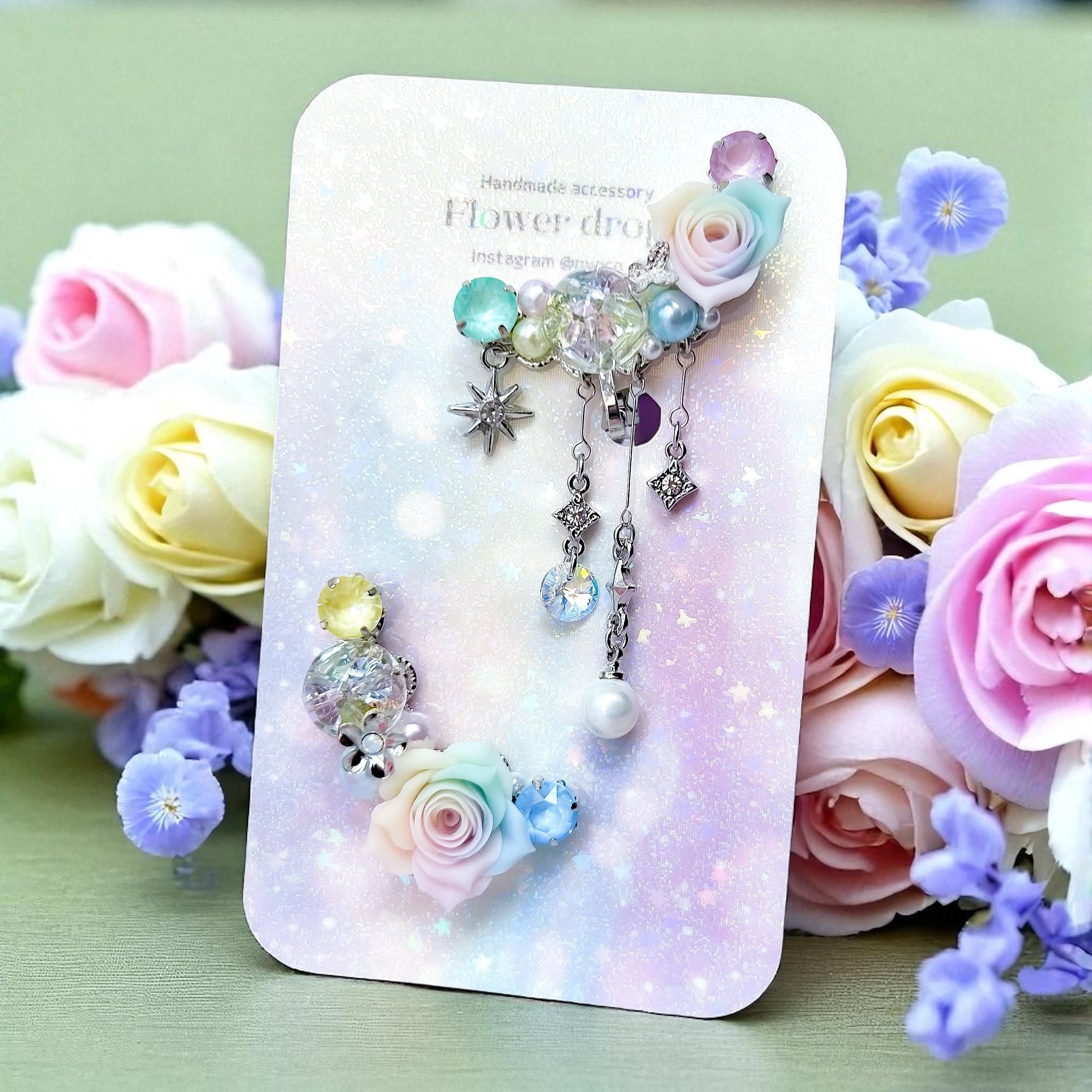 クリスタルドームビジュー♥クレイフラワーのイヤーカフ(ローズ/マルチカラー)