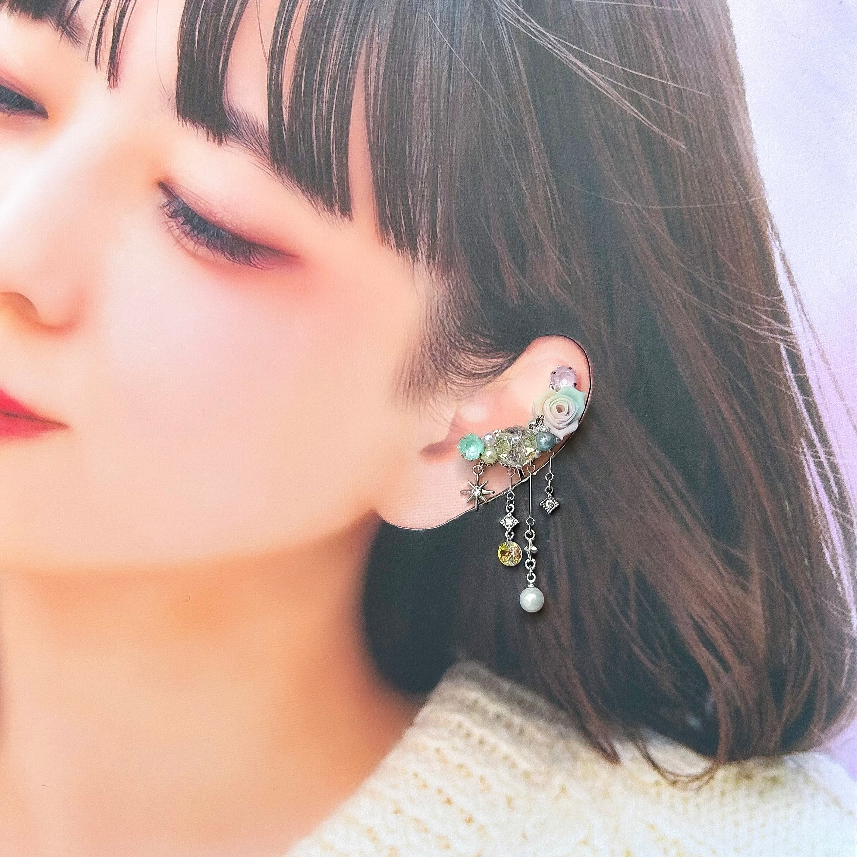 華やかなビジューデザインが魅力のハンドメイドイヤーカフ2点セットです。樹脂粘土パーツやスワロフスキー・クリスタルのダイヤカットストーン、パール、オリジナルのレジンパーツを贅沢に組み合わせ、耳元をエレガントに彩ります。