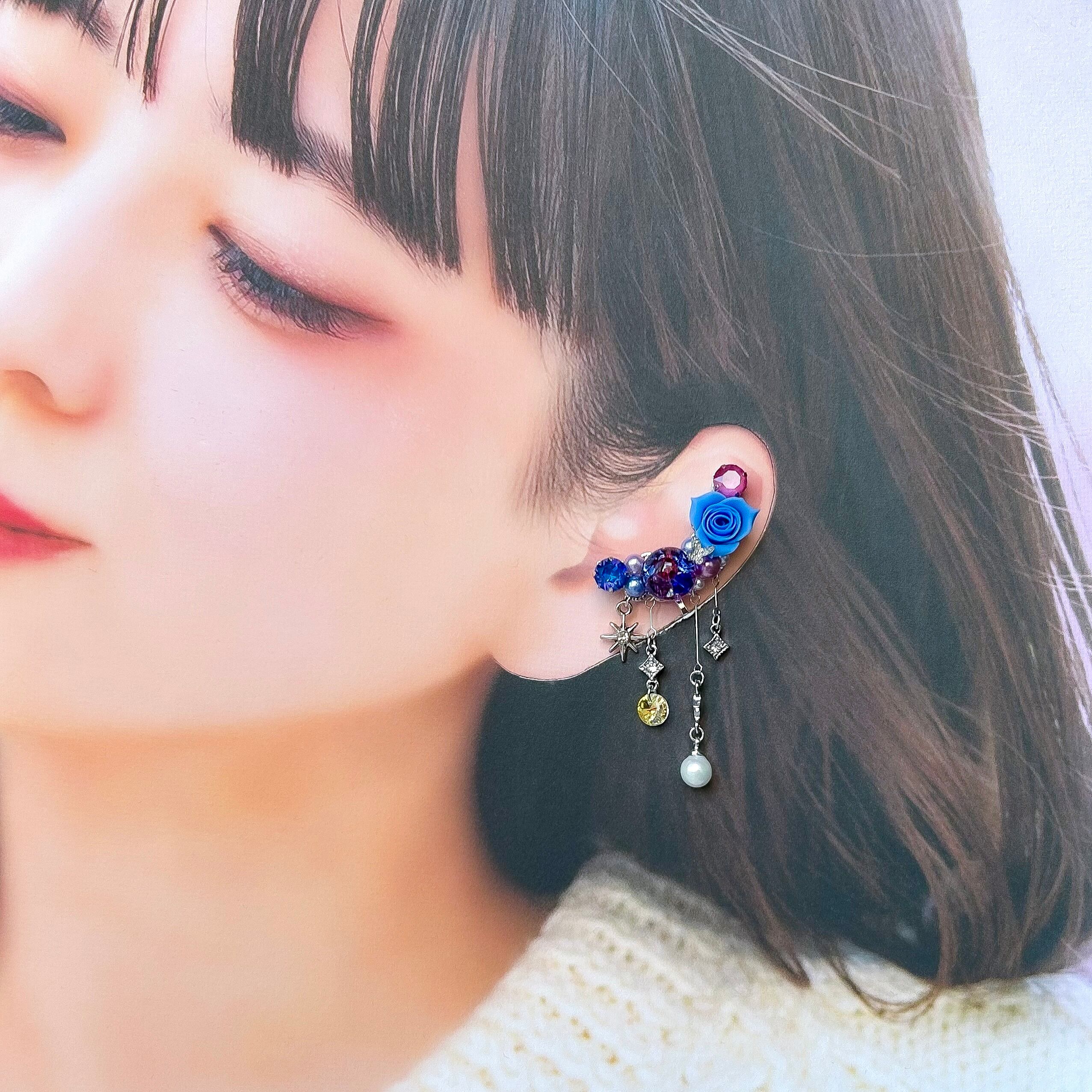 クリスタルドームビジュー♥クレイフラワーのイヤーカフ(ローズ/マゼンタ・ブルー)