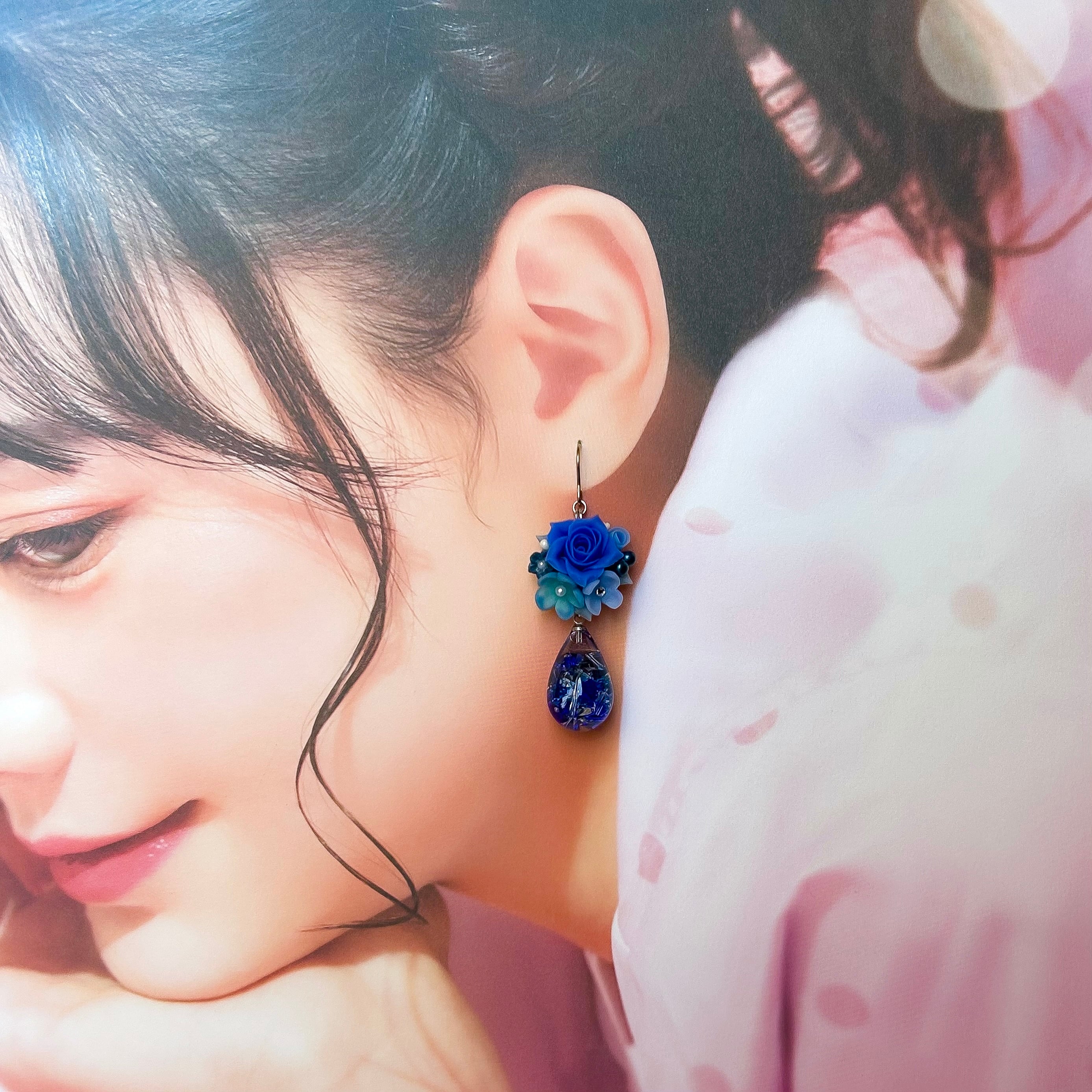 煌めくしずく♥クレイフラワーの耳飾り(ローズ/ブルー)