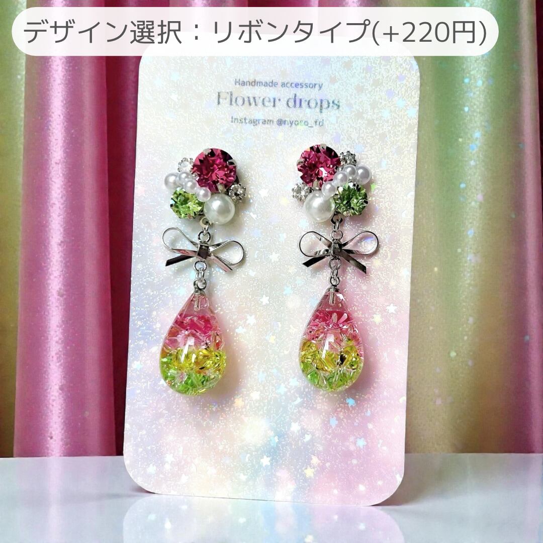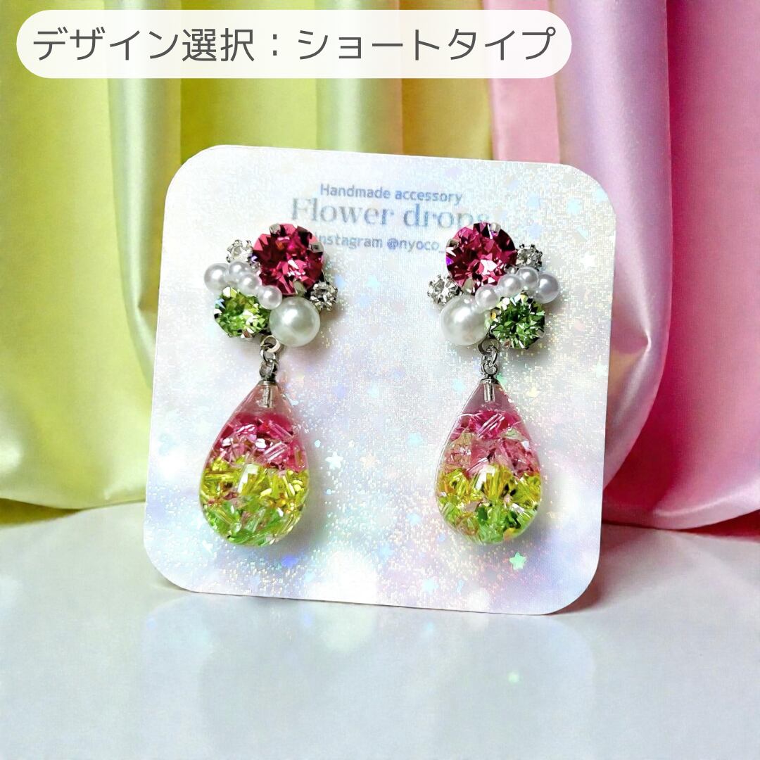 煌めくしずく♥ビジューの耳飾り(ピンク・黄緑)