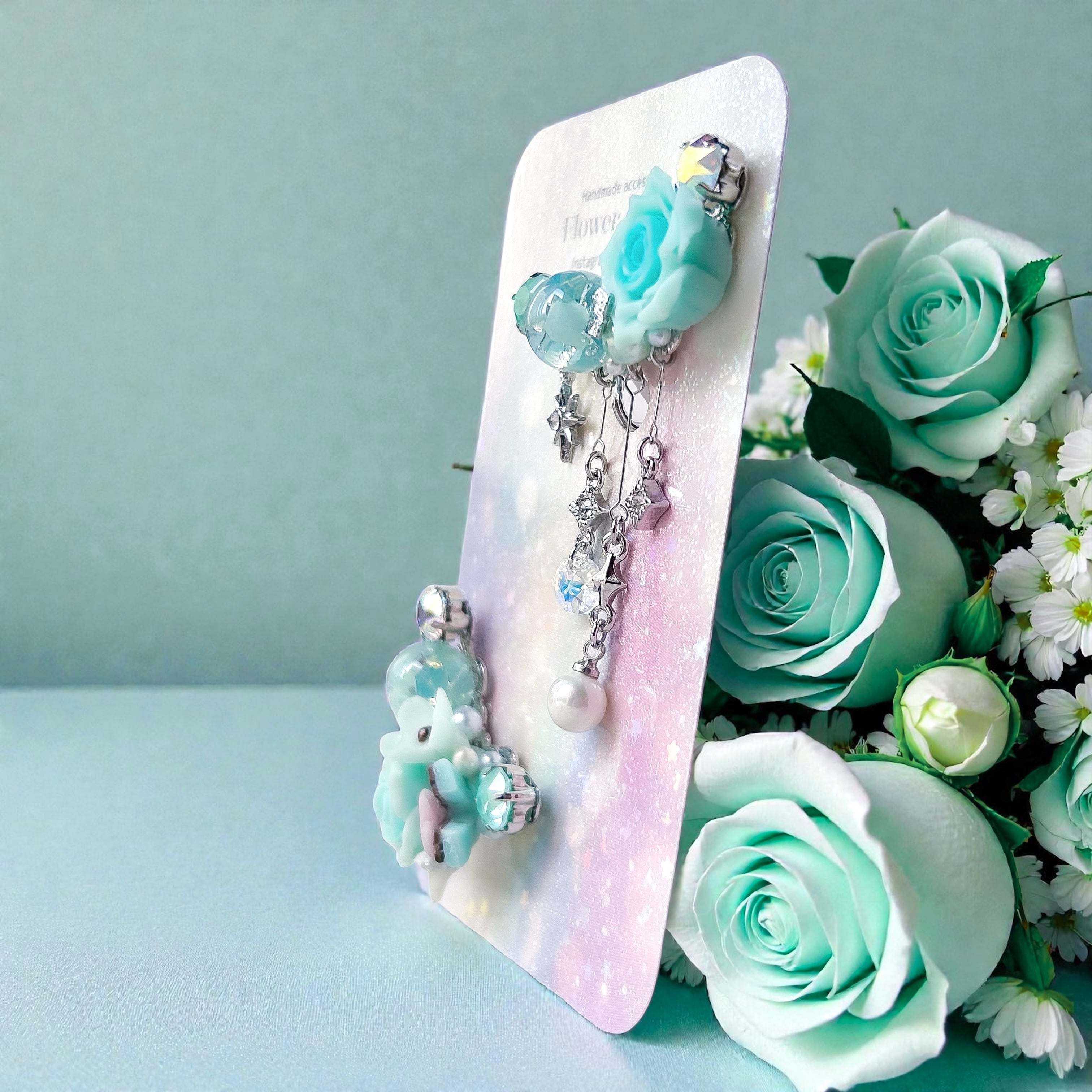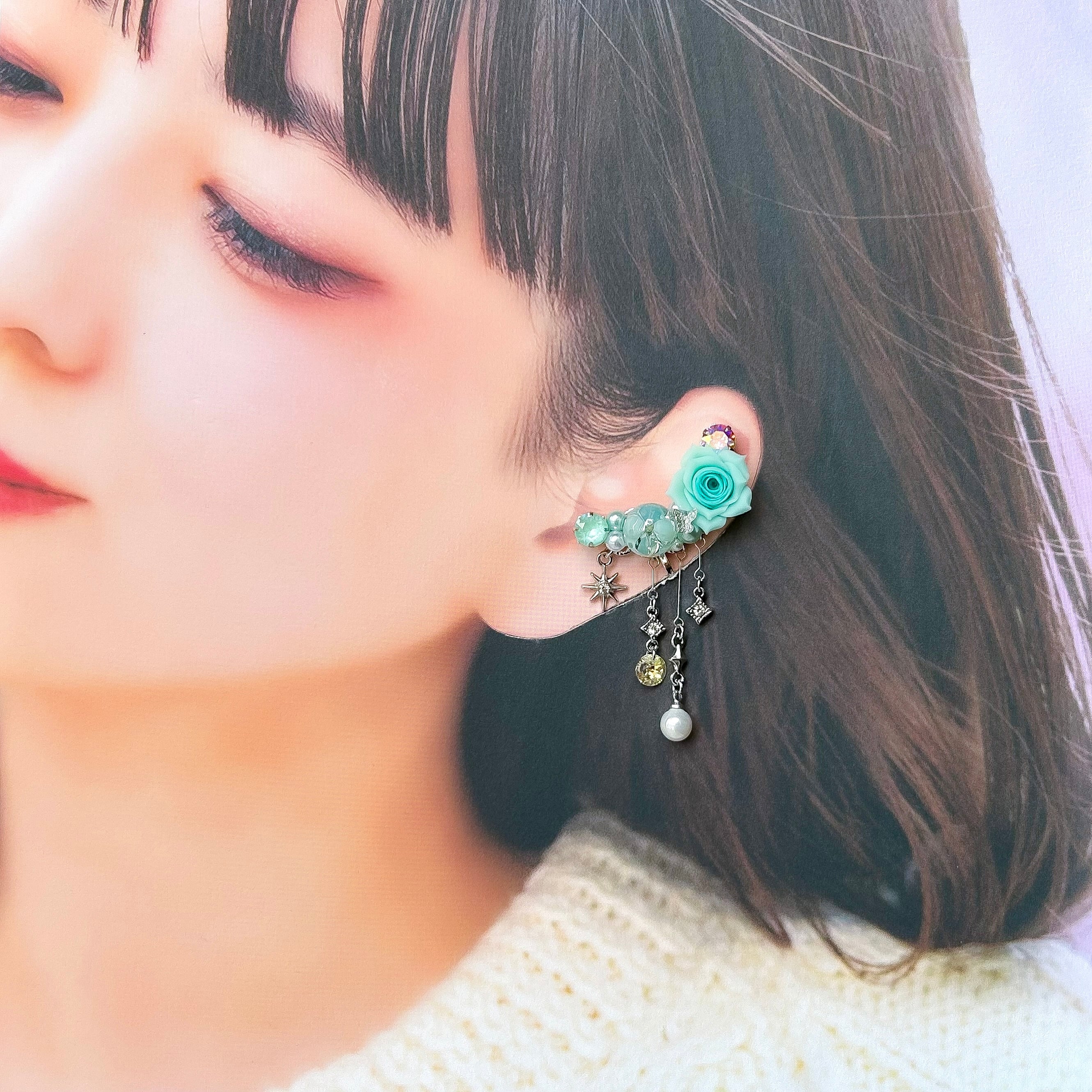 クリスタルドームビジュー♥クレイフラワーのイヤーカフ(ローズ/ミントグリーン)